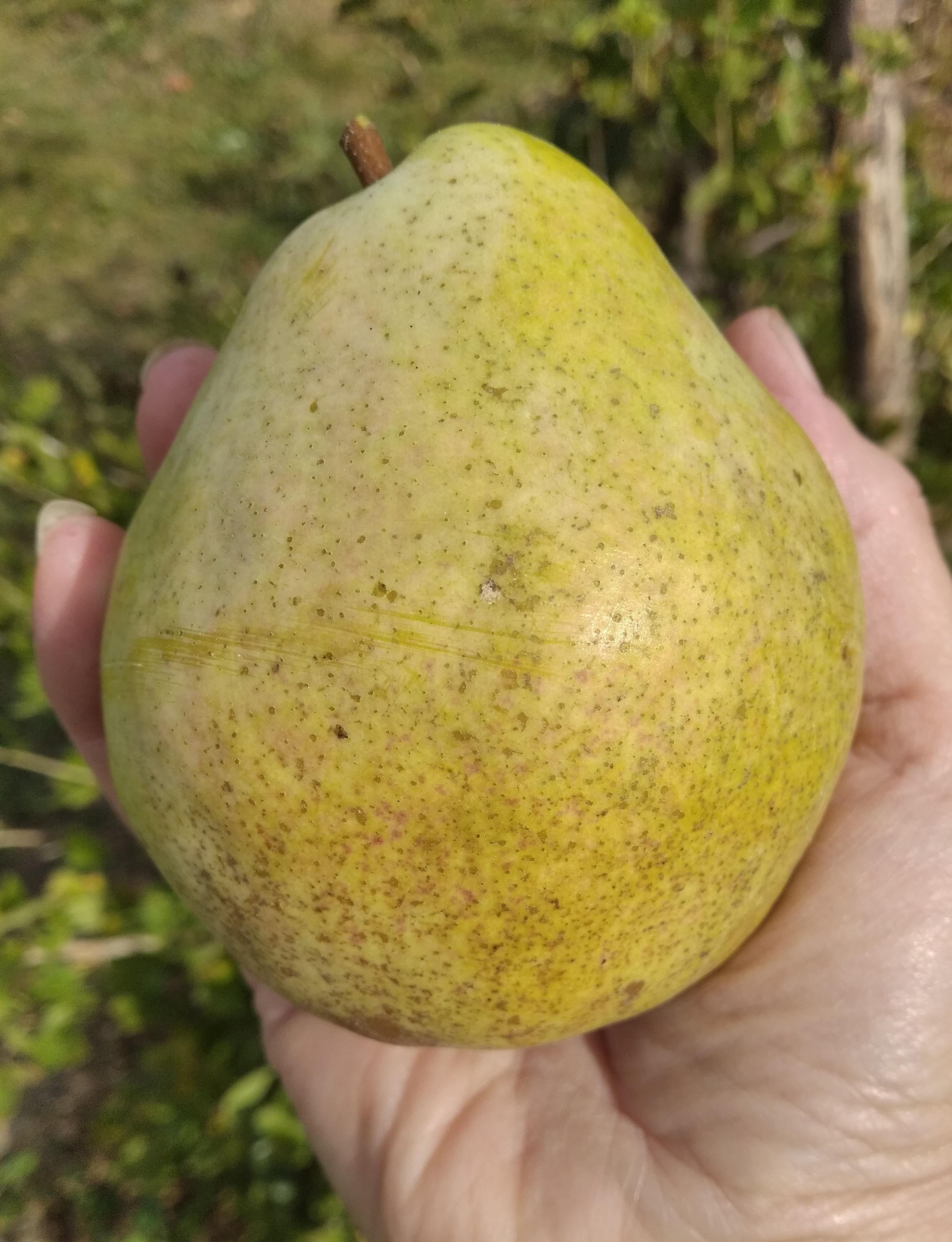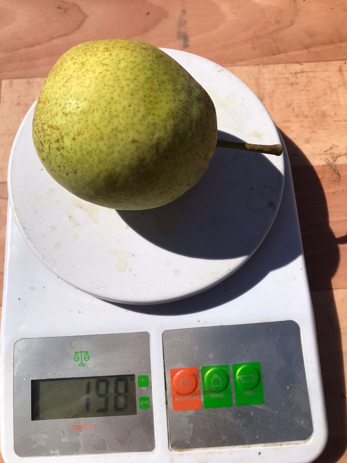 Гибрид 10-112. Удивительно много сгнило. После сильного ливня растрескались многие плоды и сгнили. Теперь о тех, что остались. Снял пораньше, чем в прошлом году. Нет этого отталкивающего привкуса, аптекарского. Похоже он сильно чувствуется у перезревших плодов. Груша дубовая на ощупь, но когда ешь, тающая маслянистая. Приятная, вкусная, но не ах. Очень серьезный недостаток- грубая кожица, мне сильно мешает. Урожайная однокалиберная, вся по 250-300 гр. Но одной прививки за глаза.