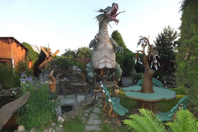 Вот такое чудо на участке сделать.ночью выйдешь .забыв о змее и сердечный приступ обеспечен.В ногах у него очаг. а дым изо рта идет.
