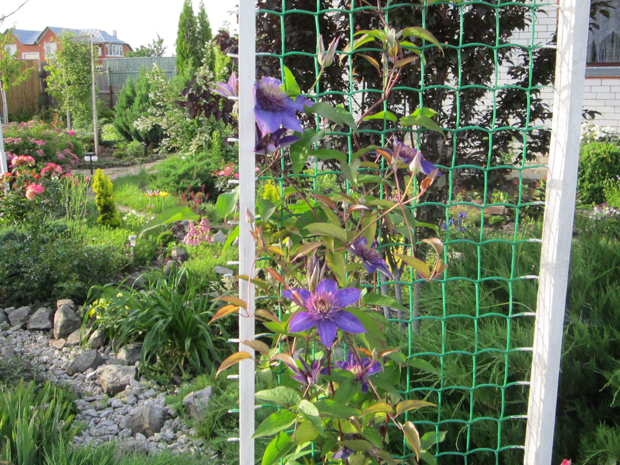 только решётка подлиннее - на 4 столба. А как вы крепили сетку к стойкам? Скобами? А сама конструкция не шатается? Спрашиваю потому, что мои магазинные металлические опоры приходится укреплять дополнительными стойками. Мульти Блю не высокий, а многие клемики имеют такую массу, что не всякая решётка выдерживает...- эти укрепляем