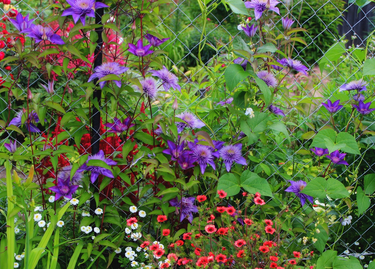 Очень красиво, Марина! Люблю панорамные снимки, а не фото отдельных растений. Всегда же интересно сочетание цветочков, вот приятно видеть камешки и другое... Мой Мульти Блю тоже на решётке,