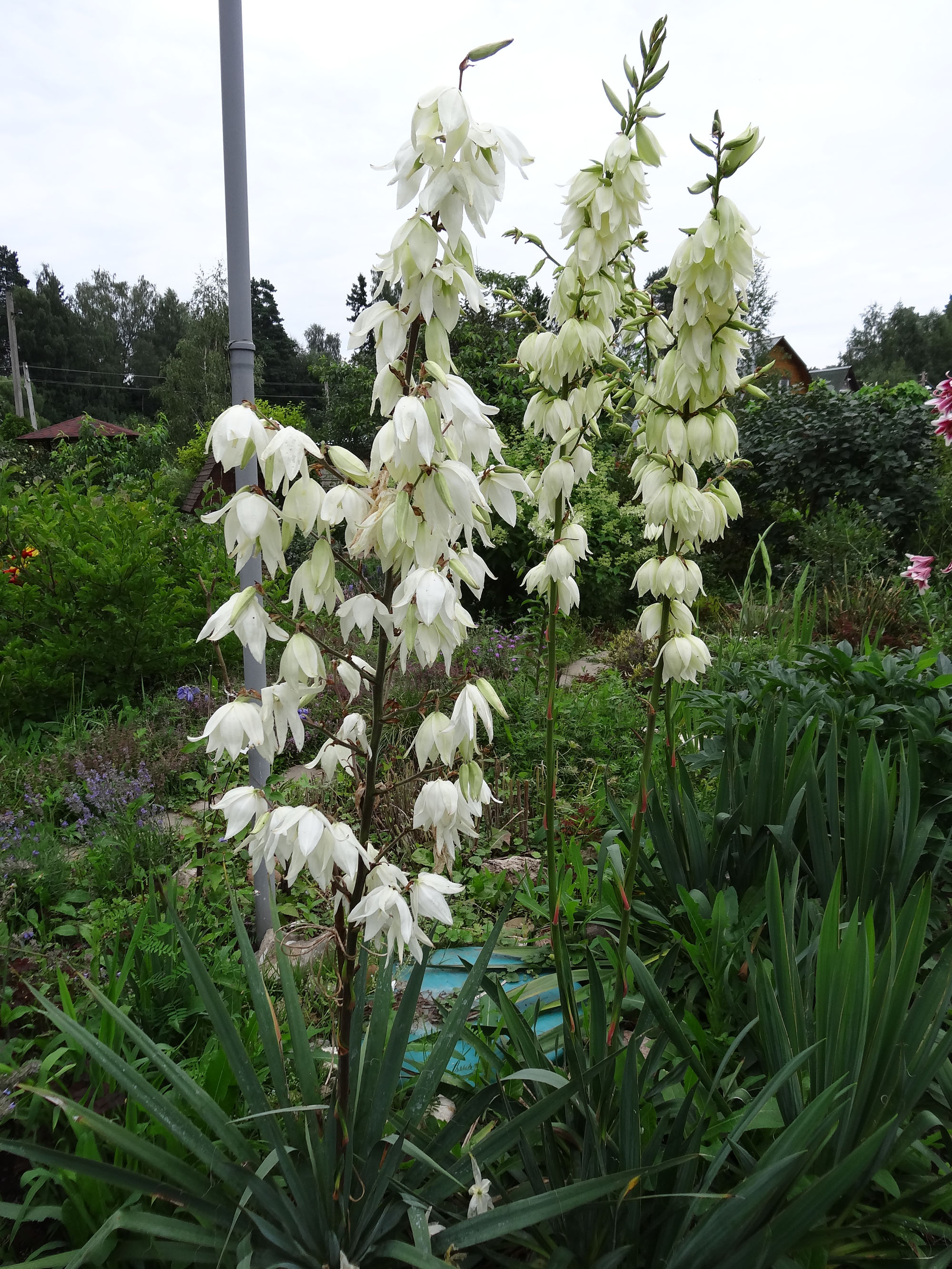 Юкка цветет красиво, но один раз в жизни, как молодила. Это мои, какие-то я покупала, какие-то сеяла семенами: Участок у меня будет похолоднее, чем в Клину. У меня Солнечногорский район, низкая пойма реки Клязьмы. В продаже есть и красивые пестролистные сорта юкки нитчатой, но мне они показались более нежными, чем видовые юкки, и после неудачи я потеряла к ним интерес.
