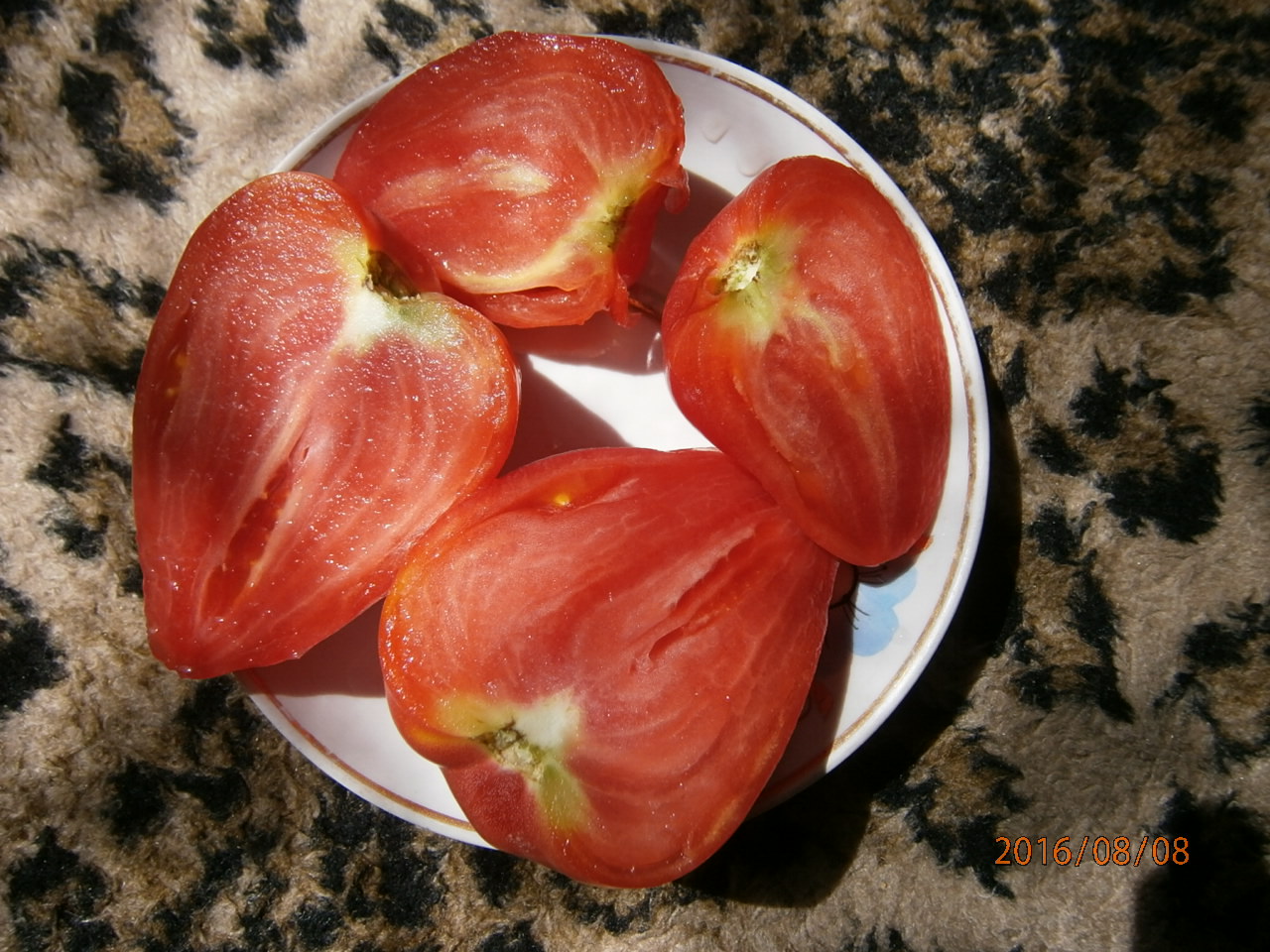 Урожайный, вкусный, сочный. Очень достойный томатик. Лен, королеву покажу через пару дней, отложила на семена, буду собирать и выложу фотку. Но вообще, куст суперурожайный. Растет в ОГ, часть томатов умерла от ВГ, и осталост наверное штук 12, все крупные, а всего 2 кисти. Если понравится на вкус, буду сажать точно.