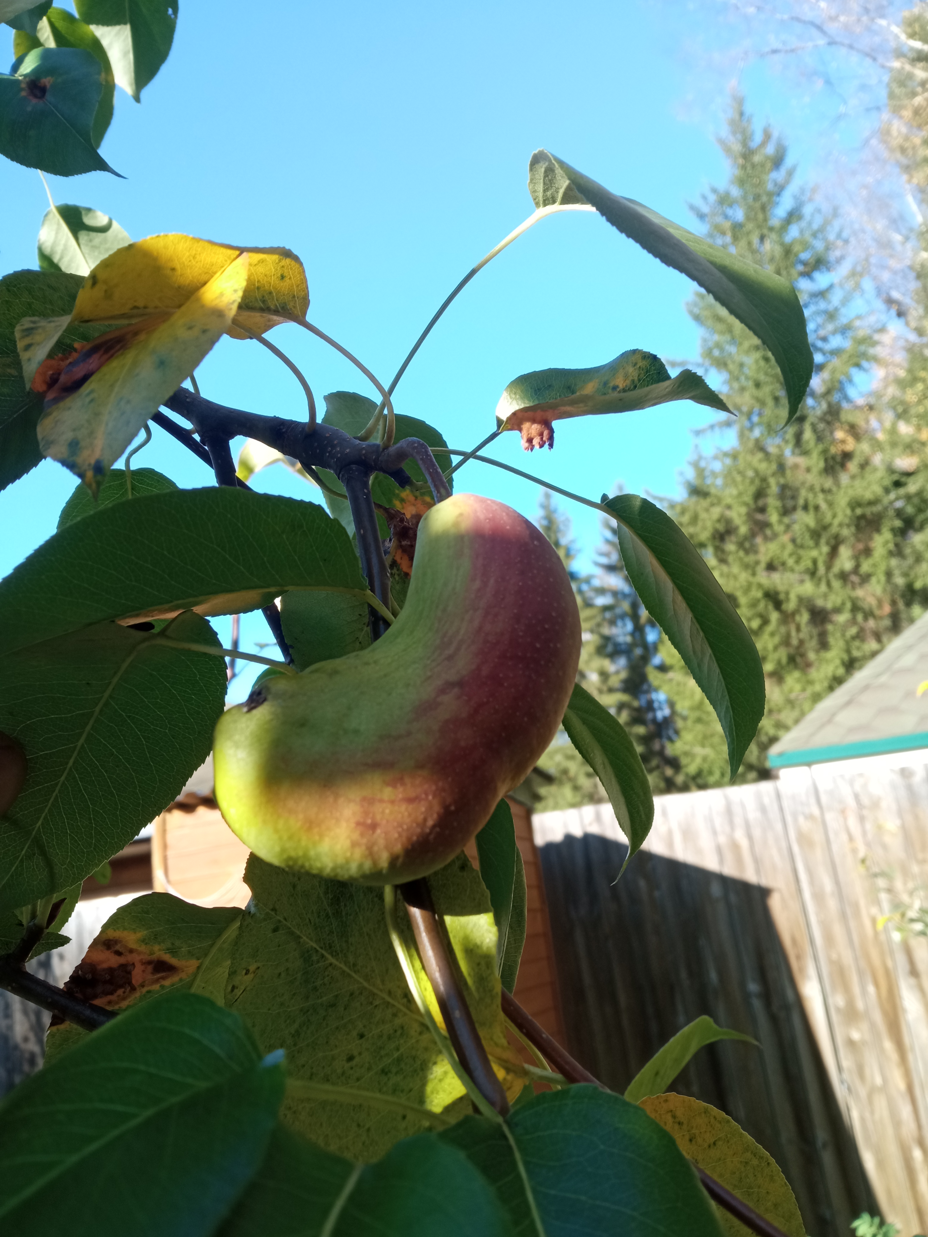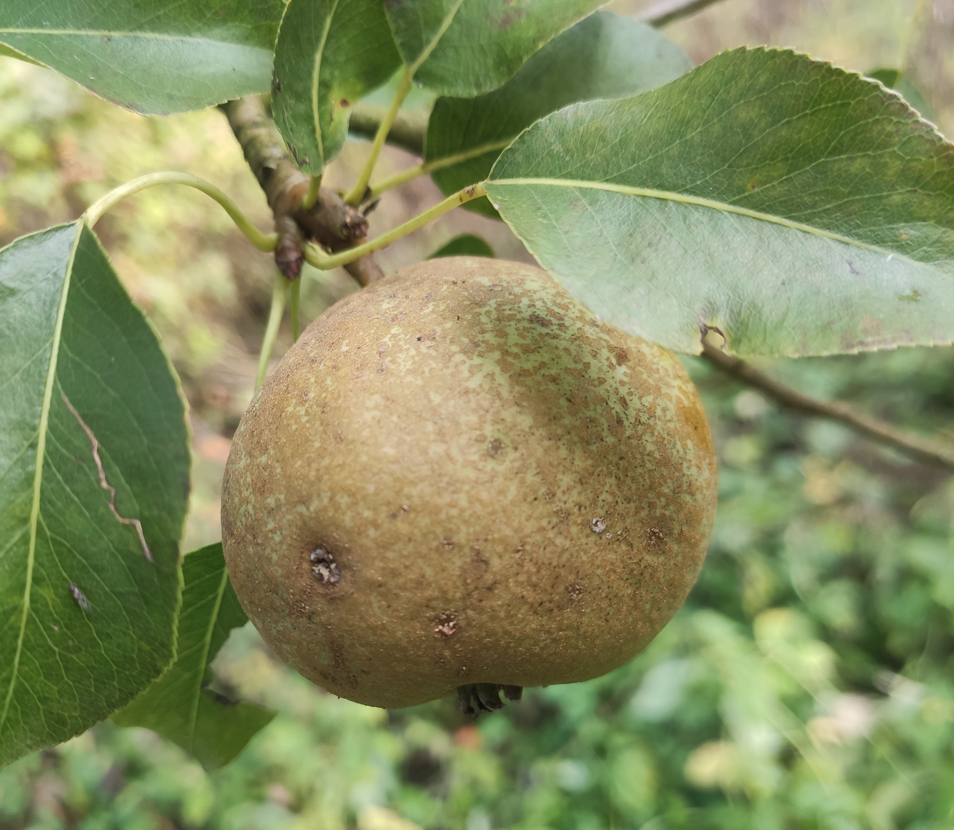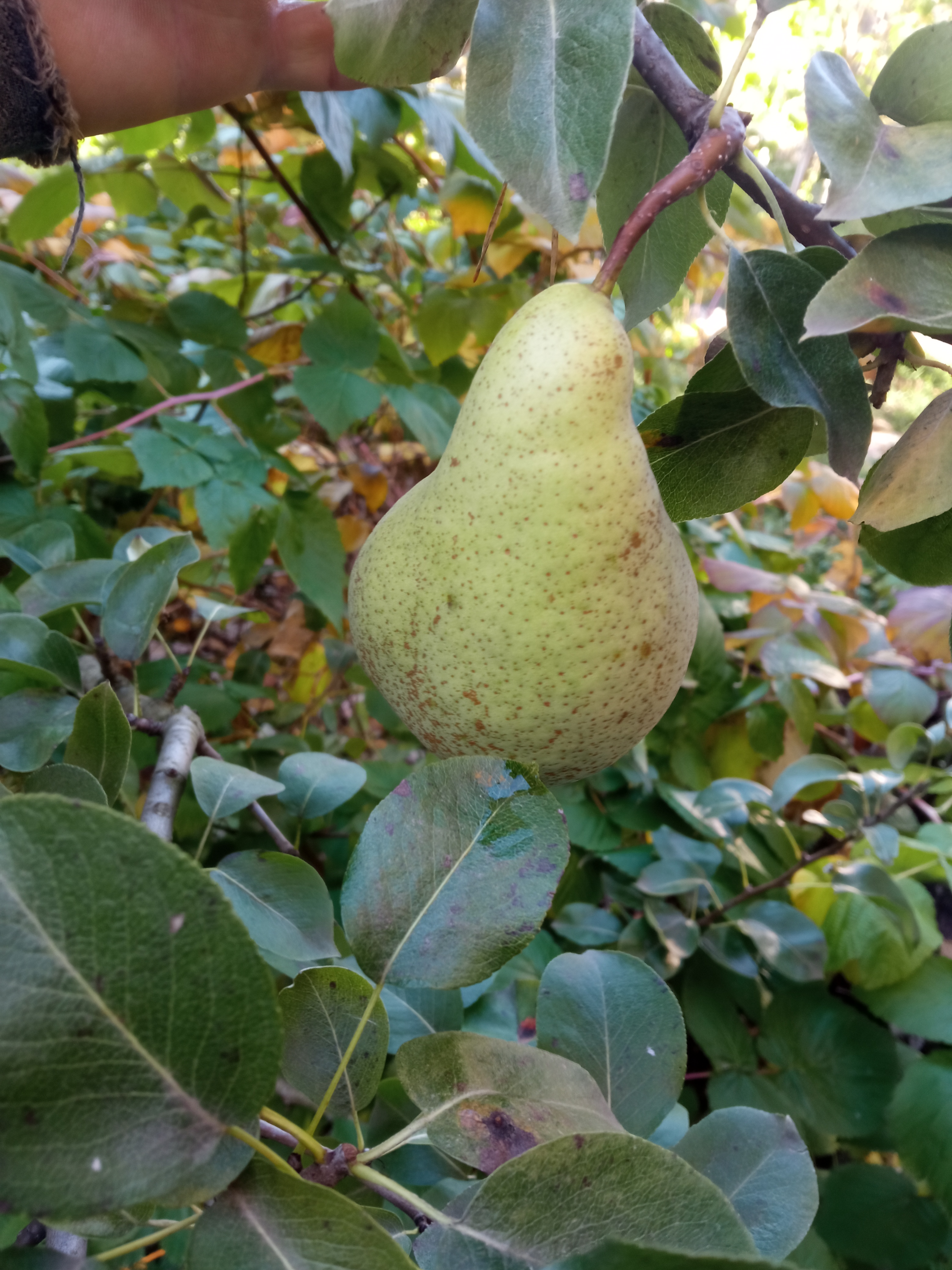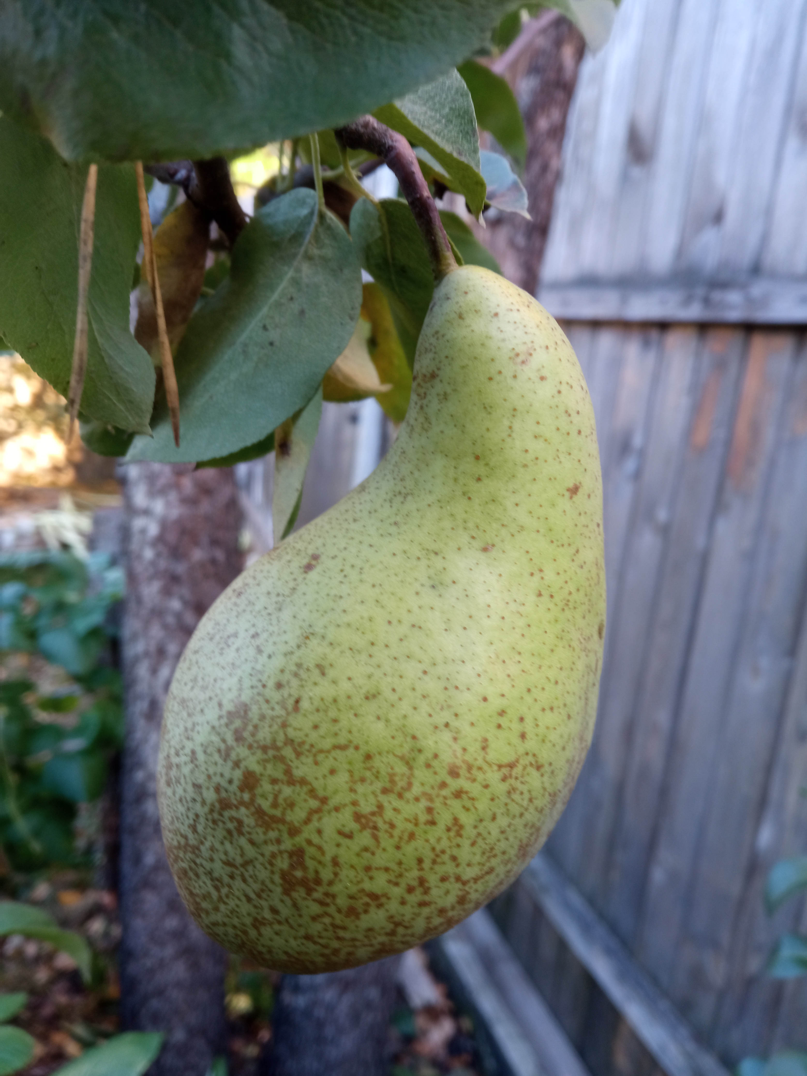 Вот моя Августовская роса. До сих пор лежит в холодильнике и на подоконнике. Сфоткал прямо сейчас. Груша вкусная, но созрела поздно, и ей в этом году приходится конкурировать с очень серьезными соперниками из более высокой лиги. P.S. Теоретически мог перепутать ее с Млиевской ранней. Две прививки на одном дереве, и с обоих птицы сорвали бирки с надписями. Но именно эту я идентифицировал месяца полтора назад как Августовскую росу.