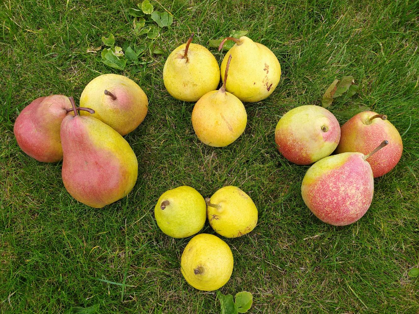 Груши Второй волны (средне-осенние). Слева по часовой стрелке: Брянская красавица, Просто Мария, Мраморная, Москвичка (в этом году мельче обычного из-за перегруза).