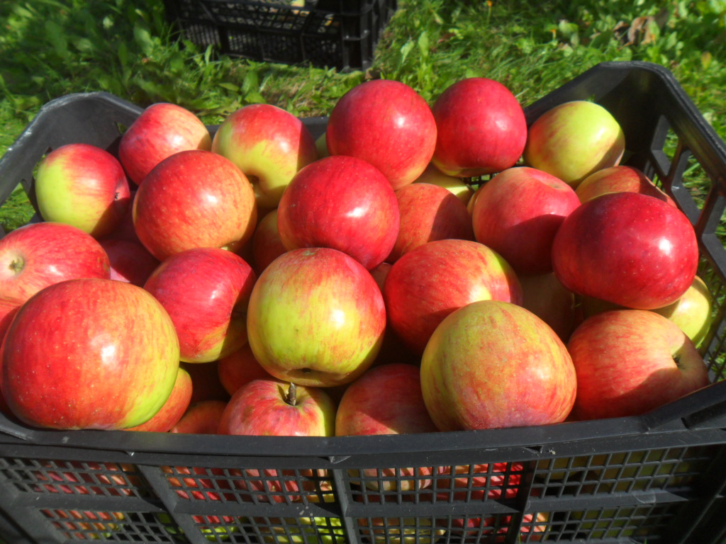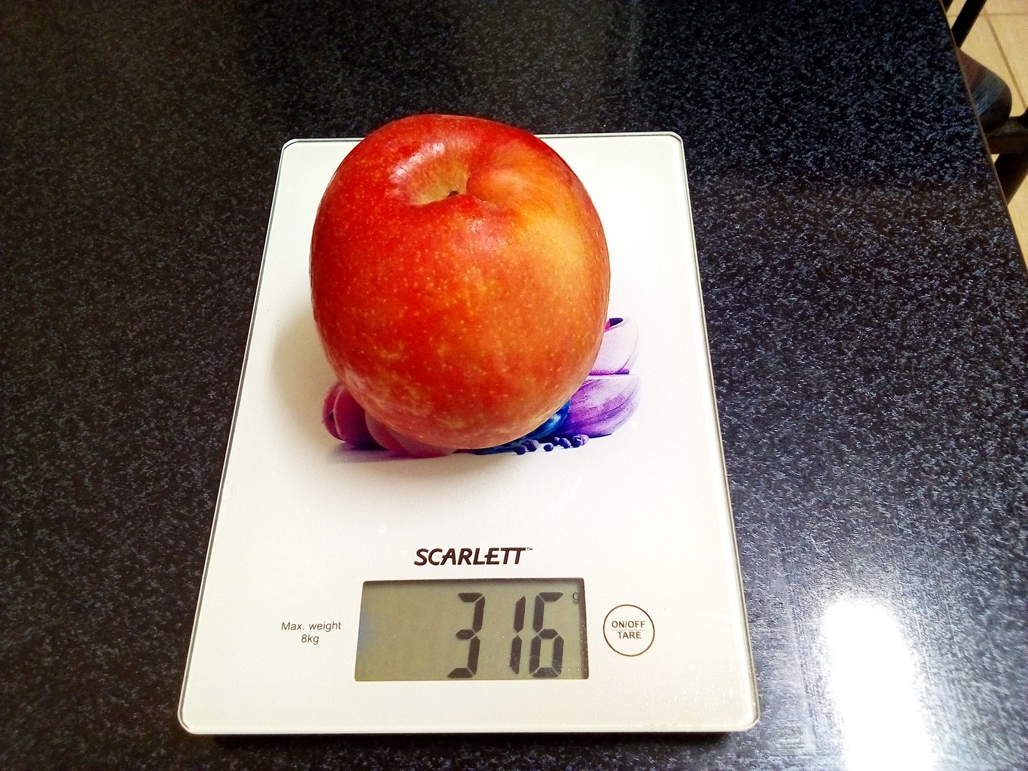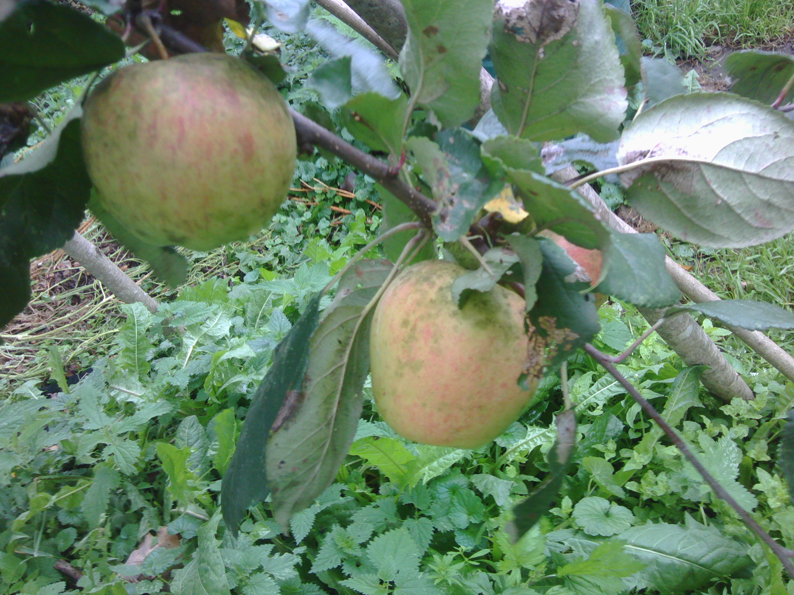 Яблоки в кроне без нормировки на расстояние 30см, за счёт этого плоды очень крупные, тяжелые, очень сочные. По вкусу приторно сладкие, мякоть пока твёрдая, из падалицы сок очень вкусный получился.
