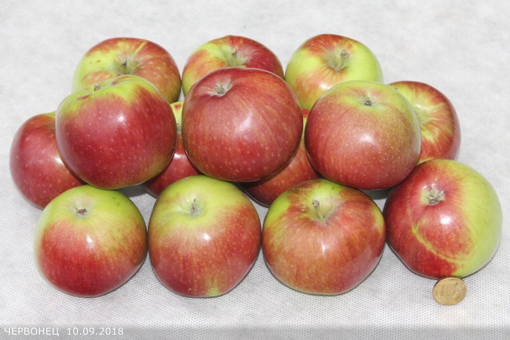 Сорт колоновидной яблони Червонец. Черенок этого сорта мне присылал Виталий Фёдорович лет 9 назад. Привить я его привил, потом перепрививал несколько раз по причинам неудачной посадки, в этом году первый раз заплодоносило 5 летнее дерево на 54-118, вернее были 2 сигналки в прошлом году, но кто то из домашних их раньше времени сорвал. Дерево растёт канделябром, и порадовало ведром красивых яблок среднего размера, плоды которого и не думали осыпаться по сравнению с другими сортами. Вкус обычный яблочный, не хуже хвалёных Орловских сортов. Возможно рановато оборвал.