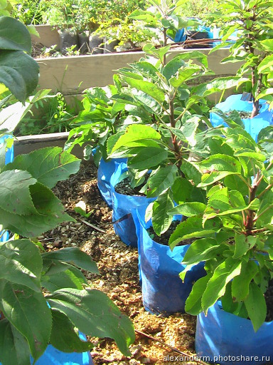 А почему Вас удивляет, что растущие в грунте саженцы опережают растущие в контейнерах(даже стоящих на подготовленной грядке)?