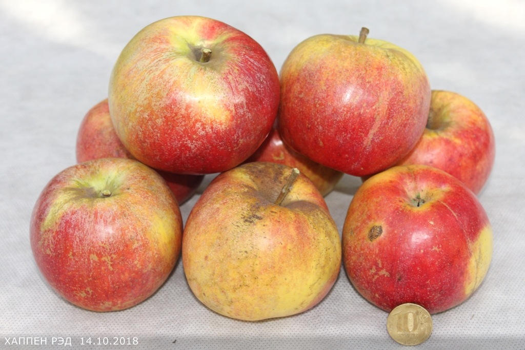Очень мне нравится неизвестный сорт, который числится у меня Хаппен Рэд. Яблоко с плотной желтой мякотью и насыщенным, сладким карамельным вкусом Голденовского типа, этот сорт пожалуй лучший по вкусу.