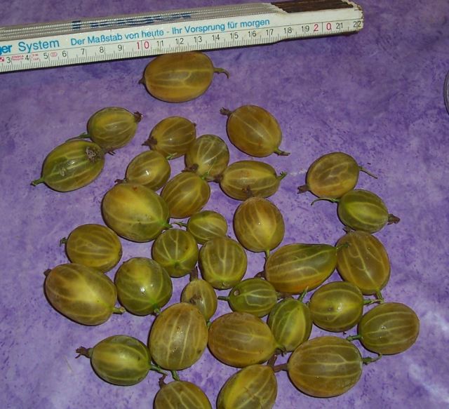 Желтый исполинский (gelbe Riesenbeere), английский Левеллер (Leveller). Ягода большая, 42 мм длины и 37 мм толщины, овальная или яйцевидная. Кожица толстая, почти гладкая, непрозрачная, нежная, зеленовато-желтая с светло-желтыми жилками. По мякоти может быть десертным и хозяйственным сортом. Куст сильный с отклоненными или свешивающимися ветвями, очень плодовитый. Ценится по своей величине но не имеет промышленного значения и разводится только в домашних садах.