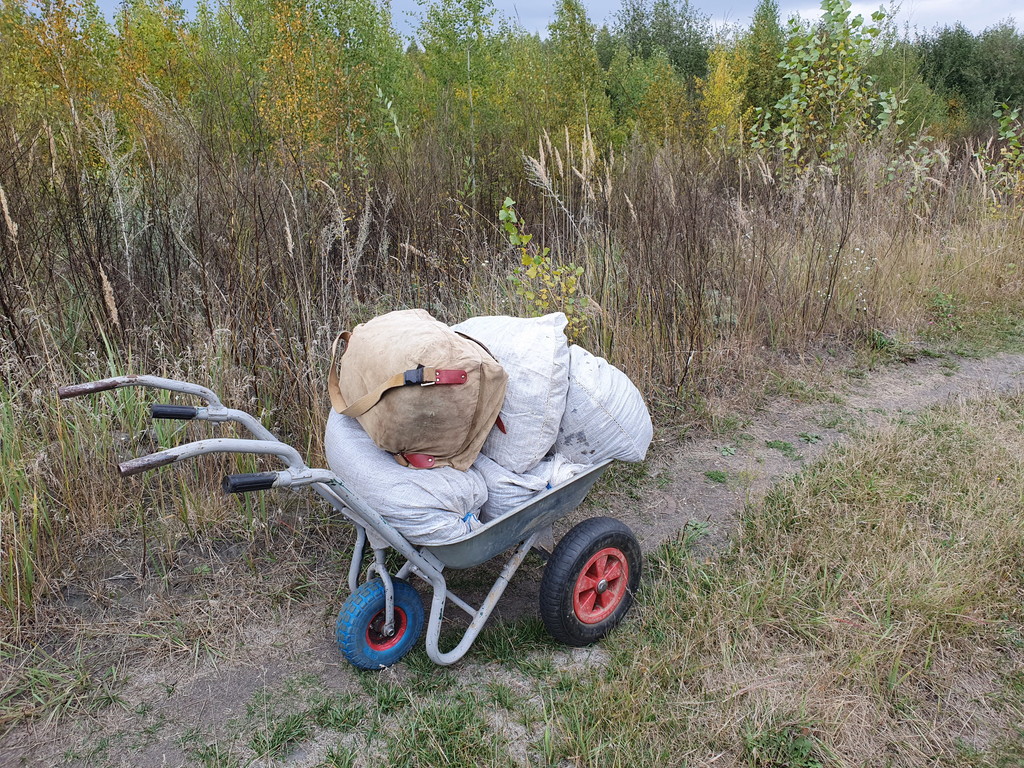 6км с тележкой туда, 6 обратно. Плюс рейсы с пешком за спиной от болота до телеги туда-обратно 2-3км. Плюс мох, плюс кора. Итог крупная грядка под голубику и еще мелкие под гортензии. Так и таскаю.