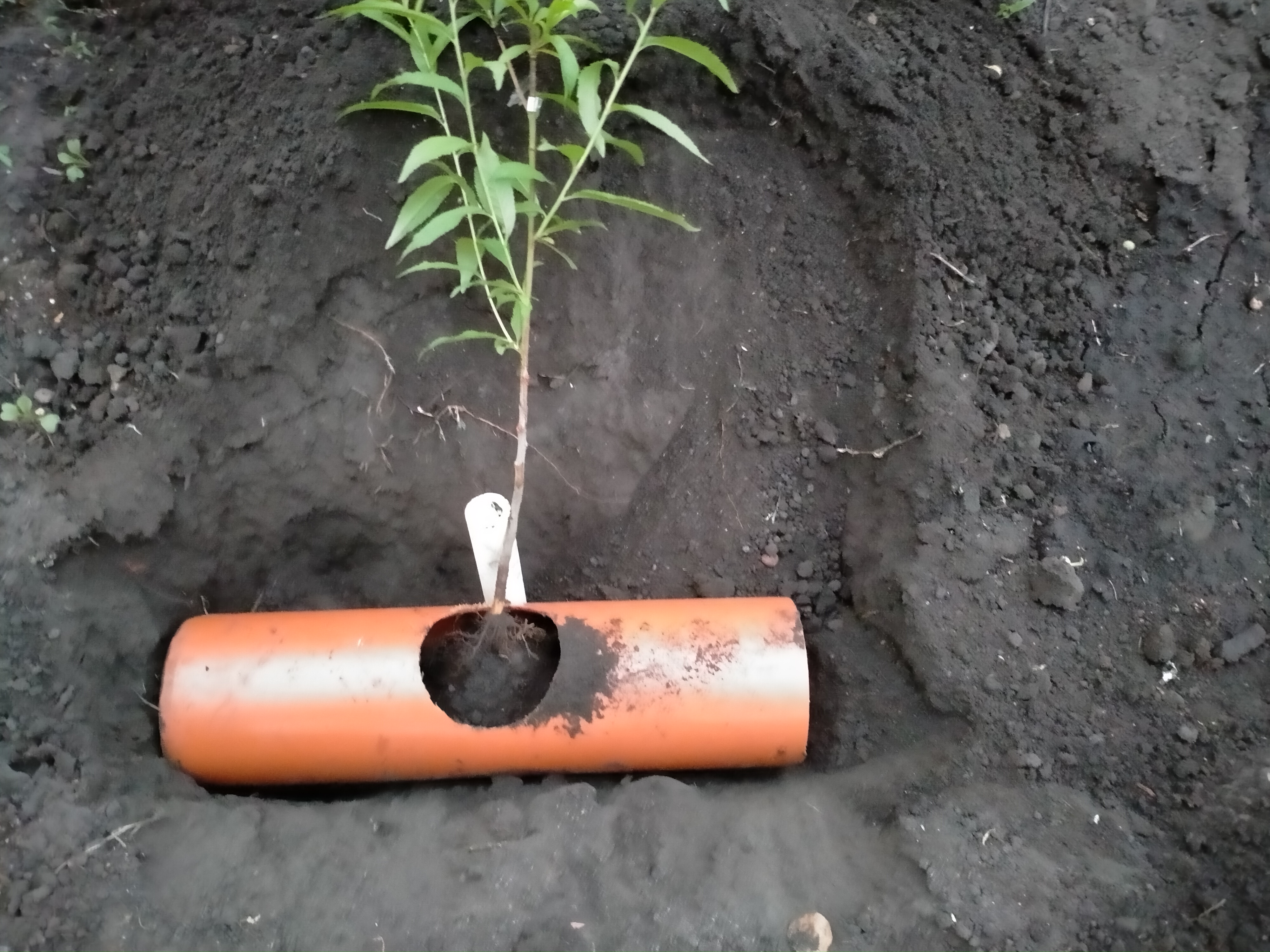 В пластине смысла мало, да и сейчас думаю что вообще можно было ничего не прикручивать. Вырез получился овальным - этого достаточно для наклона ствола на первые годы, ведь надо чтоб вышедшие наружу из трубы корни сначала окрепли, соответственно и трубу не стоит вообще поворачивать первый год или два.