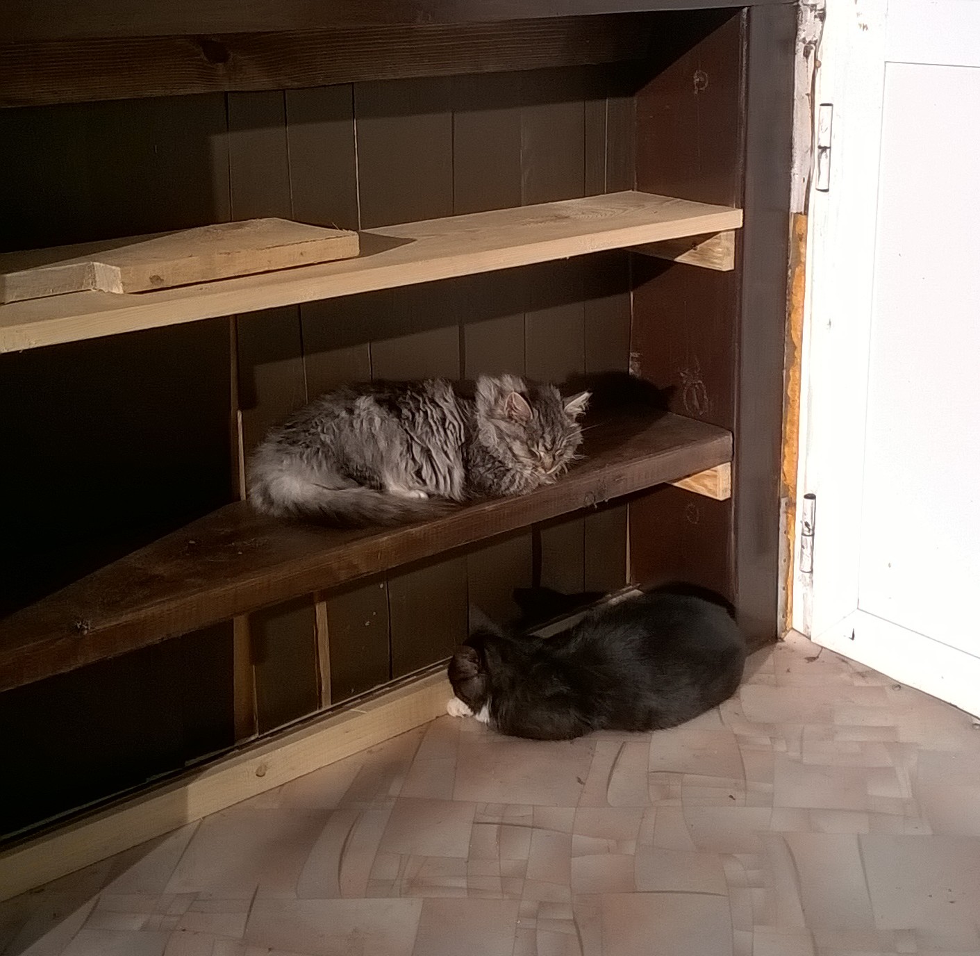 Возможно, этому поспособствовала ночевка в походных условиях, то бишь на улице. Продухи в подпол я закрыл и теперь кошек надо провожать индивидуально по их личным запросам через три двери. Для возвращения им приходится караулить под дверями, пока кто-нибудь не пройдет.