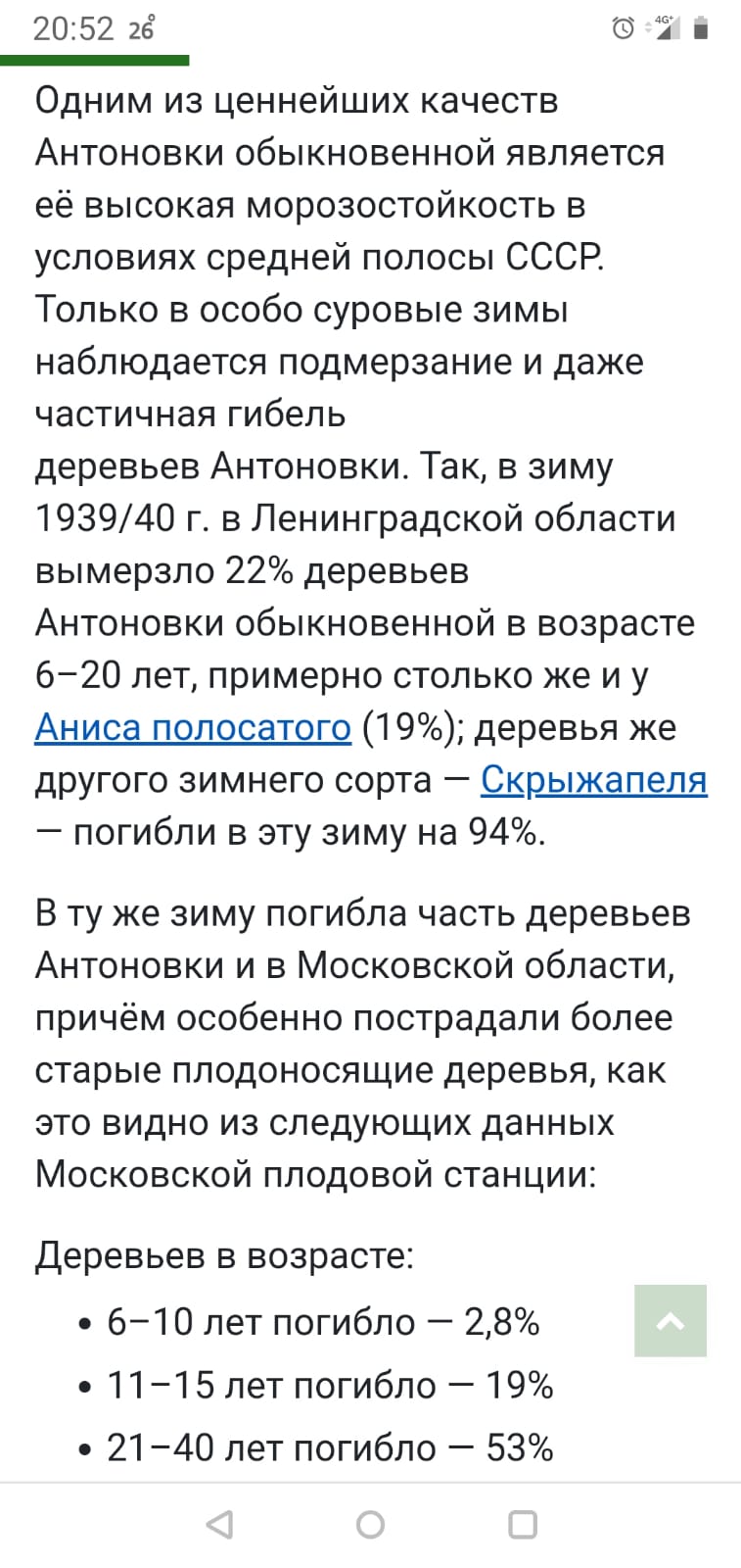 По крайней мере Антоновка это единственный сорт сохранившийся с довоенной посадки в саду деда в Бутово к концу 90-х гг. Да и тут в старых садах Антоновки 50-60 летние , пережившие зиму 1978/79, 2016/17 не редкость.