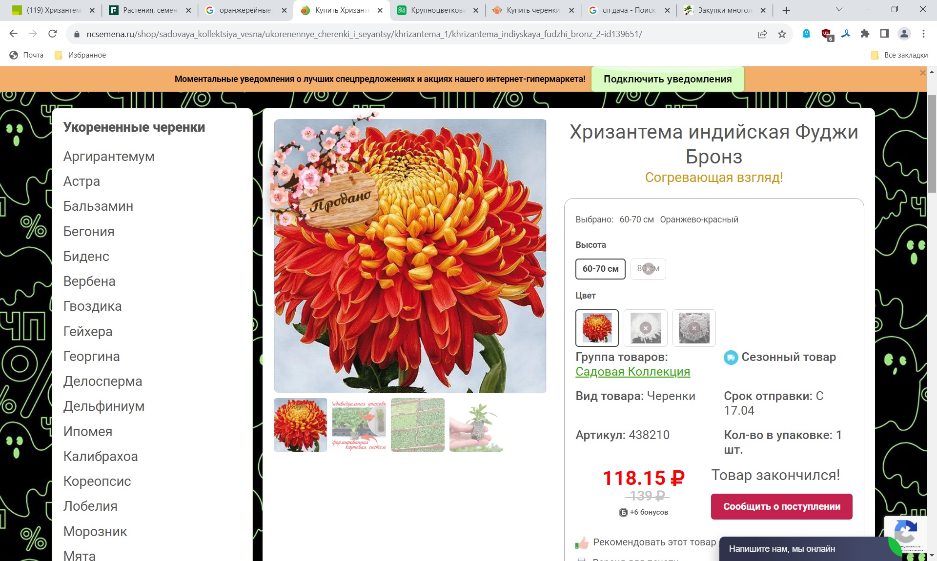 А так вводите в Гугле, например, запрос "оранжерейные крупноцветковые индийские хризантемы саженцы купить" и заказываете, есть ИМ, где можно заказать на весну сейчас. В прошлые годы были укорененные черенки и в Русском Огороде, в этом году, может, появятся позже. В закупках от ЕТК хризантемы обходятся вдвое-втрое дешевле, чем в ИМ, т.к. в закупках цены - оптовые (в 2023 в закупке от ЕТК хризантемы были около 60 руб/шт).