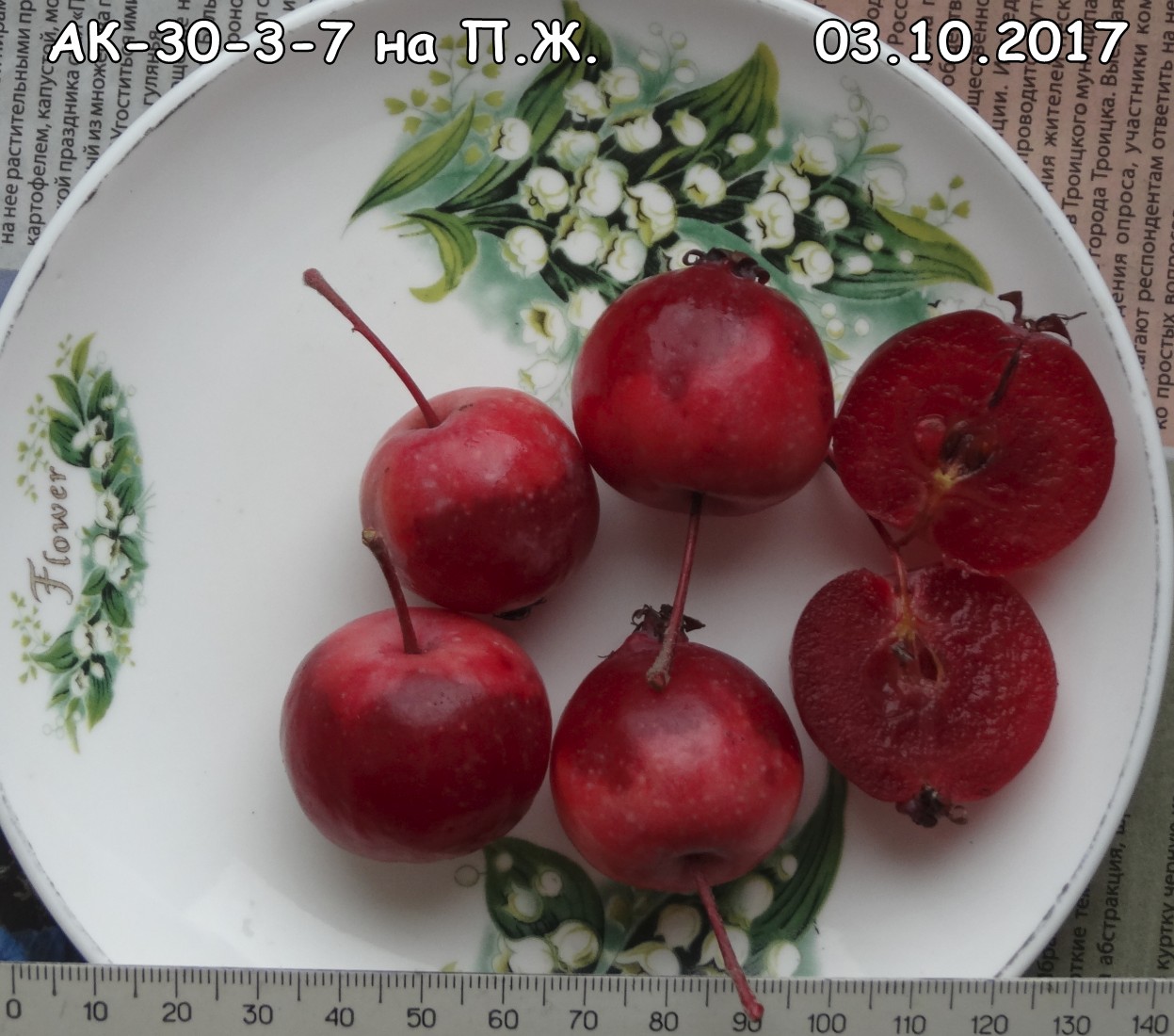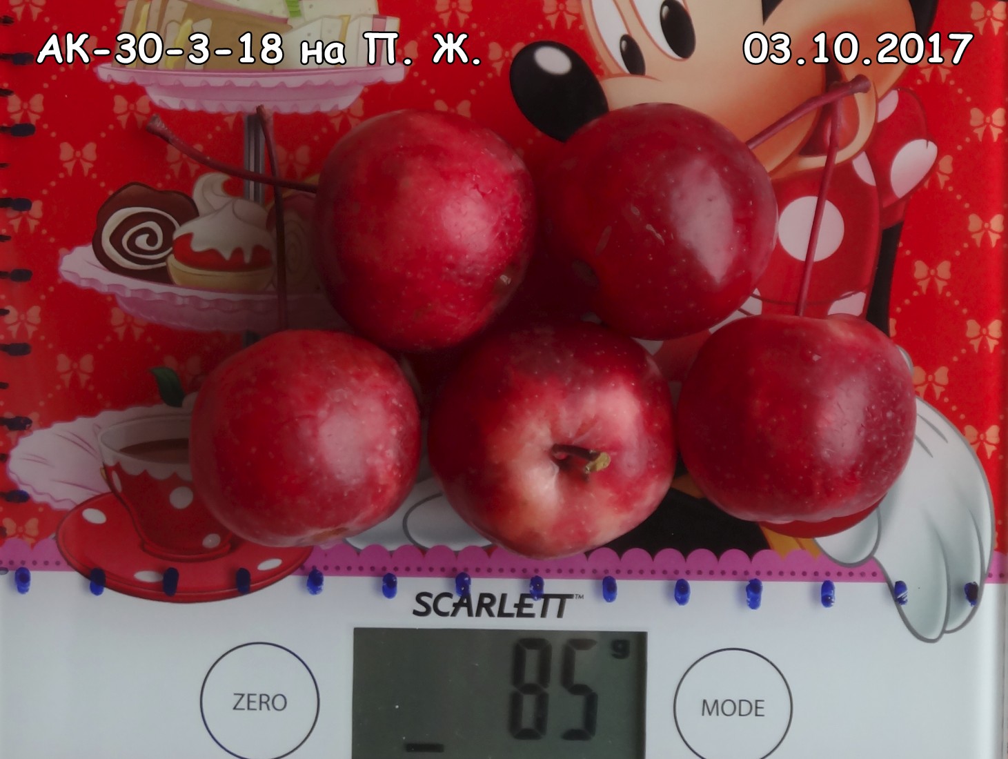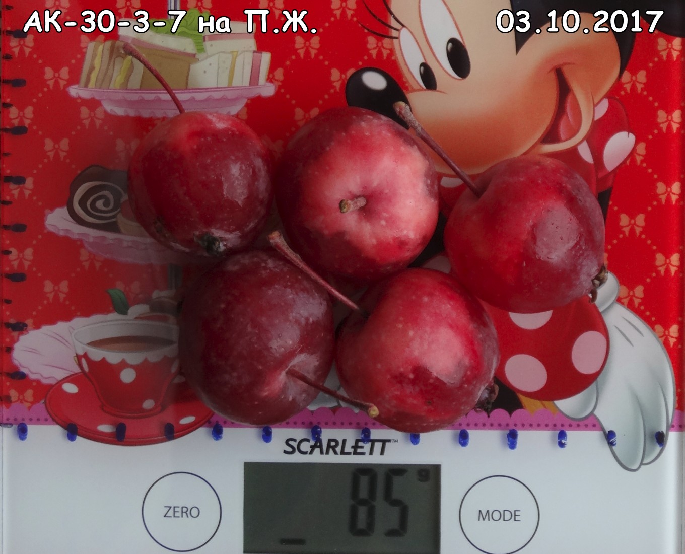 АК-30-3-16, прививка 2016 года в крону Памяти Жаворонкова, первое плодоношение, 9 штук. Вкус кисло-сладкий, во рту вяжущее послевкусие. Некоторые ранетки переспелые, но держались крепко.