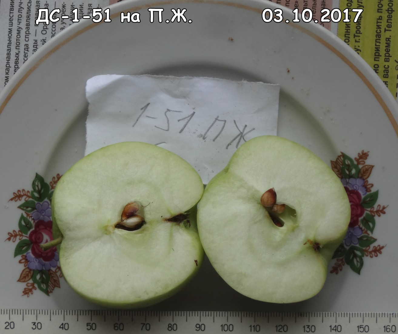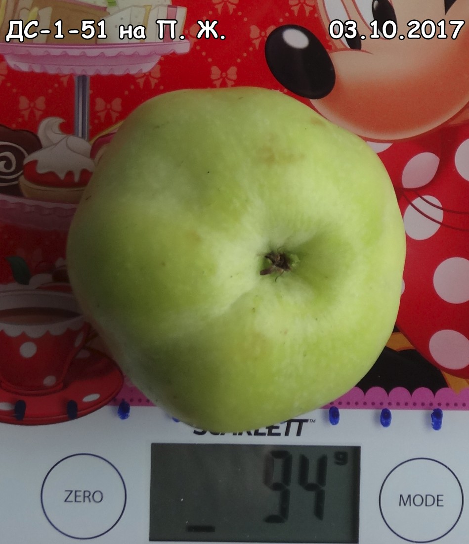 ДС-1-51, прививка 2016 года в крону Памяти Жаворонкова, первое плодоношение, одно яблоко. Вкусное, кисловато-сладкое, твердоватое, сочное, но чувствуется, что не дозрело и должно ещё полежать. Зимнего или поздне-осеннего срока потребления. На дереве держалось прочно.