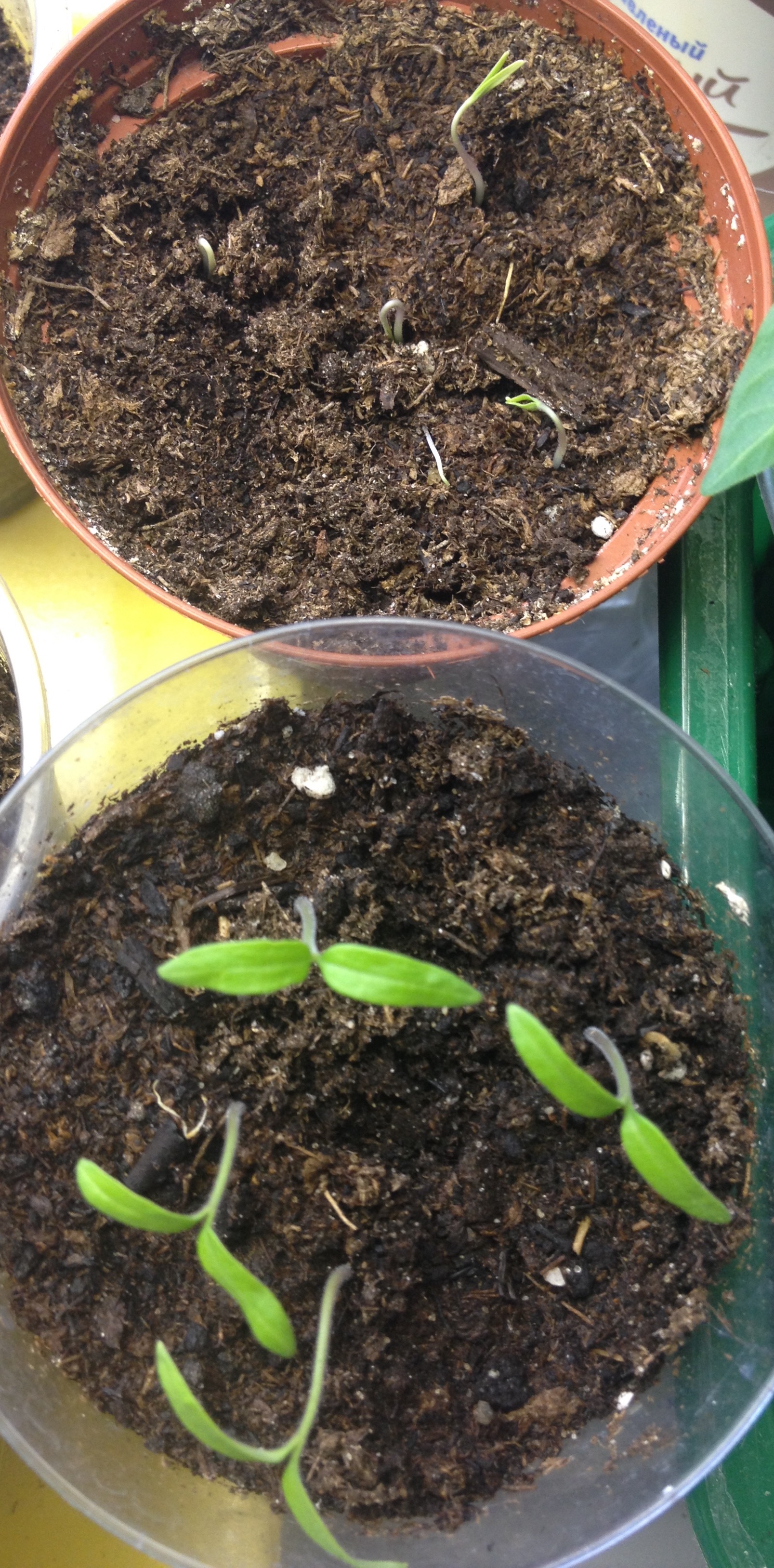Я уже говорила, что с покупного пакетика у меня плоды были мельче и всходили дольше. Посеяла 2 семечка прошлогодних, взошли одни из первых, в рассаде все же немного выше остальных, уже радует, что похоже на славянку.