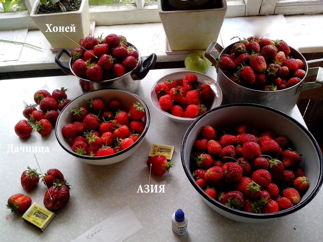 Но первый сбор регулярно был плохого вкуса, не набирал сахара. Может, и моя вина... Вот недавно прочитала, что калий нужно вносить с осени, тогда он успеет дойти до растения. Я вносила его ранней весной. Последующие сборы были лучше, но к тому времени прикупила сортов повкуснее. По устойчивости ко всяким бякам Хоней - достойный сорт. У меня не хватал ни клещика, ни болезней. А, когда с осени засыпала его коровьим перегноем в пару сантиметров, то урожайность стала, как на фото с дуршлаком.