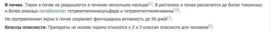 борисыч, Я уже привёл пример препарата с тирамом предназначенного для опрыскивания картофеля ПО БОТВЕ от фитофторы. И это разрешено в с/х. Тут ролик по проливу овощной рассады от Гавриш /Липилина Ирина Владимировна, агроном, кандидат с.х. наук, группа компаний "Гавриш"/ препаратом "здоровая земля" с тирамом.