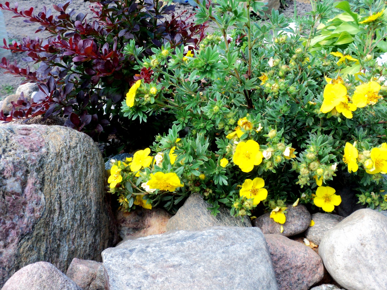 Татьян! Прям "просятся" на подсадку ещё пара таких же маленьких кустиков лапчатки. Сейчас, мне кажется, не "в композиции единой" Ваши растения, а просто "сидят" четыре самостоятельные "штуки". Не находите, что хорошо бы ещё лапчатку между барбарисом поместить и в центре "треугольника"- между хостой, барбарисом, можжевельником. Эти бы новенькие "замирили бы" своей остренькой, меленькой листвой барбарис и можжевельник. Да и цветы жёлтые на фоне вишнёвого куста, да всё лето, эффектно смотреться будут. Но, настоящий ландшафтник сказал бы, что неправильно Вы посадили - на углу сажать надо было "плюшку" хосту вместо шара-барбариса. Да ещё и места ей(хосте) "про запас" оставить, она уже в следующее лето "даст".