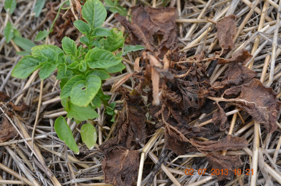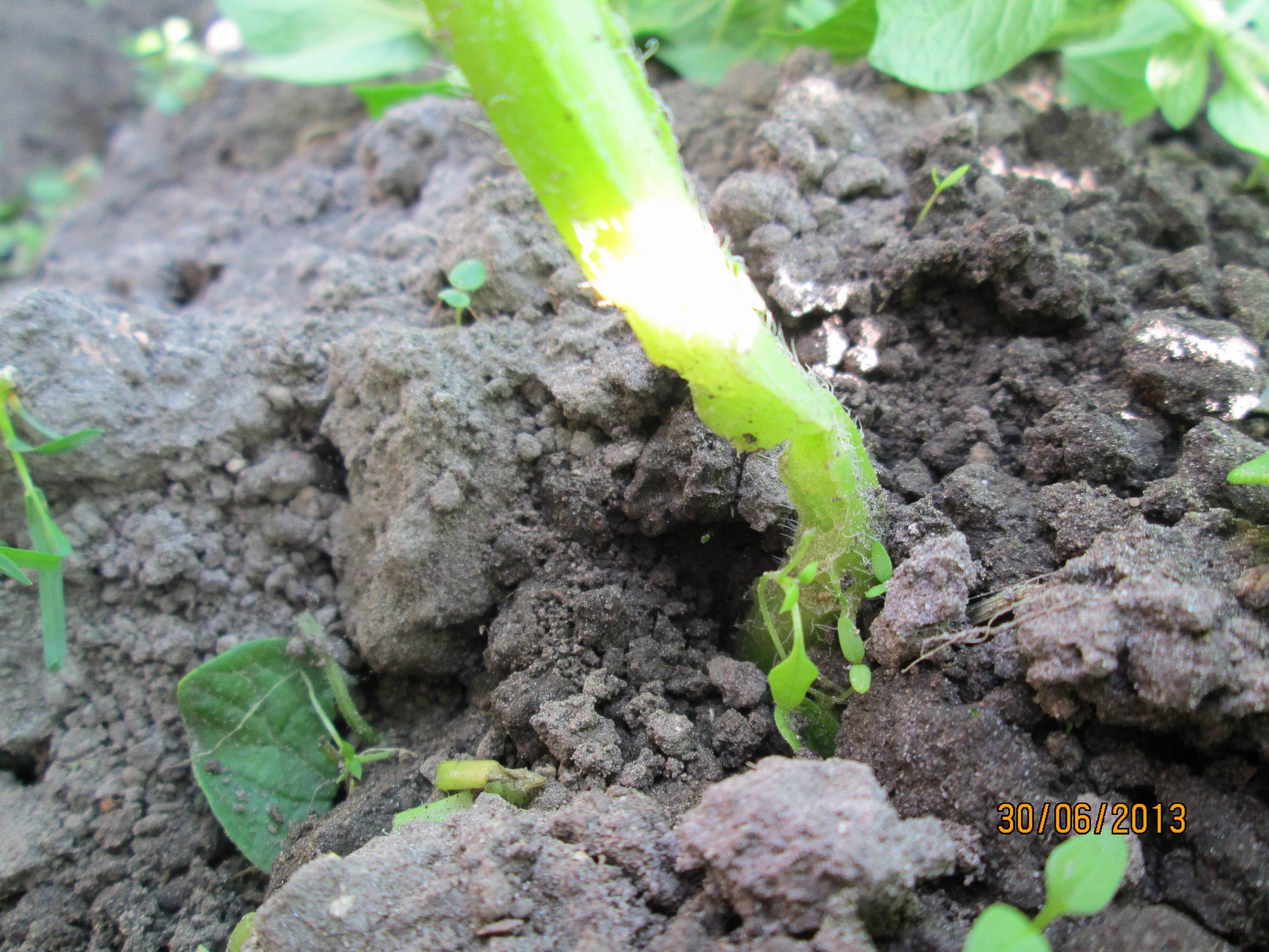 Прибежал сосед и сказал, что кто-то отгрызает стебли картохи на уровне земли. Это впервые в нашей деревне. Он перелопатил в возле погрыза землю, но никого не нашёл. Я сходил сделал фото