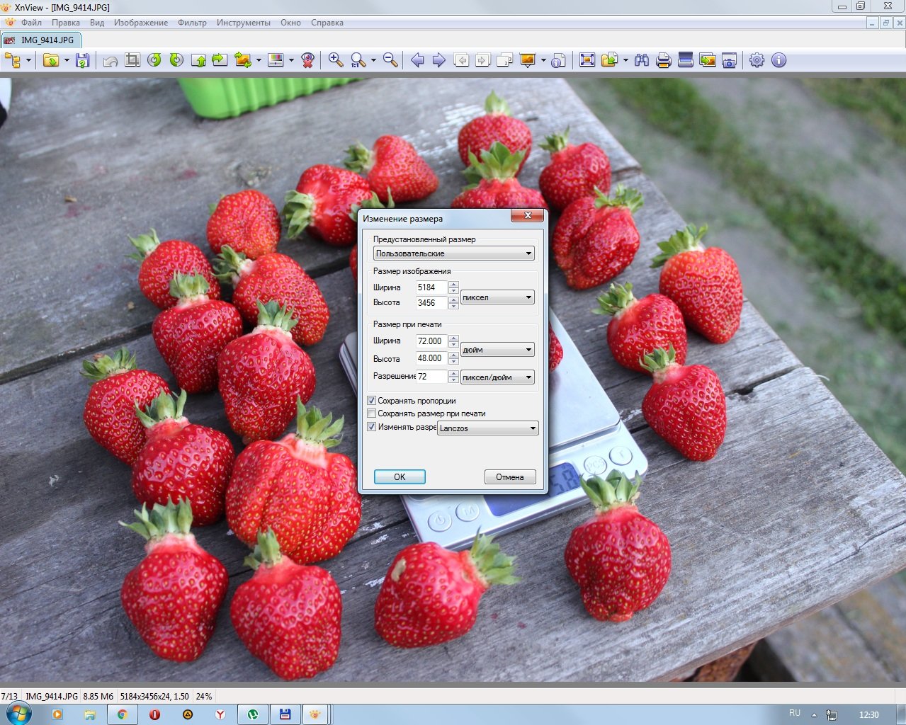 1. Выбираю исходный файл. Весит он порядка 9 Мб., что для форума много. 2. Открываю его программой XnView (у меня по умолчанию двойным щелчком мыши) 3. Выбираю в меню Изображение команду Изменение размера или на главном экране жмете комбинацию Shift + S. 4. Выскочит окошко 5. Изменяем ширину до 1600 или 1920 (вполне достаточно для форума). Должна стоять галочка Сохранять пропорции (как на скриншоте) Жмем OK.