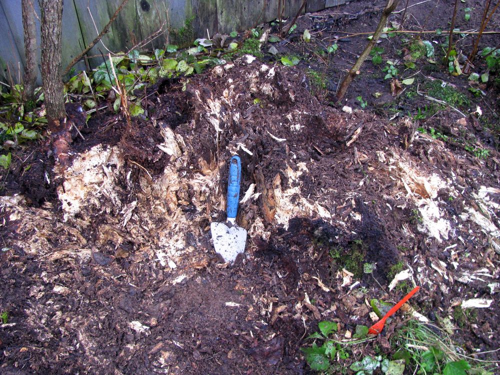 Пенек мужа - елка. Топор и пила. Время трудозатрат 4.5 часа. Мой. Береза. Совочек. 1.5 часа