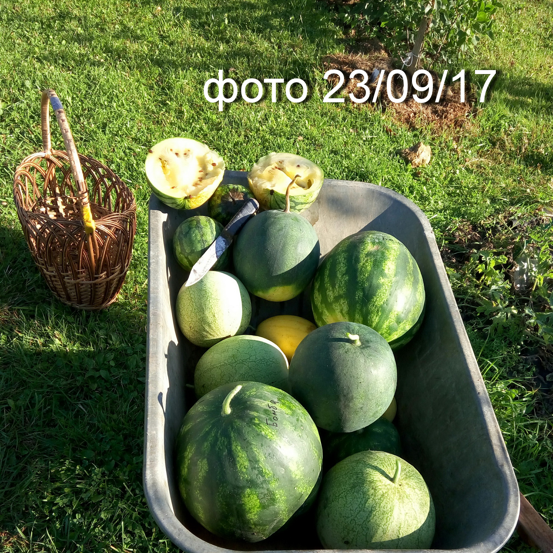 Основная часть арбузов убрана. Почти все из своих семян. И притом большая часть с желтой мякотью. Пока 6 штук съедены - все были желтые. Они оч сладкие и тонкокорые. Единственный из покупных семян-Кримсон Вондер, порадовал новым моим рекордом - 10960гр. До этого максимум у меня за 8кг росли. Все в о.г. и на черной нетканке.