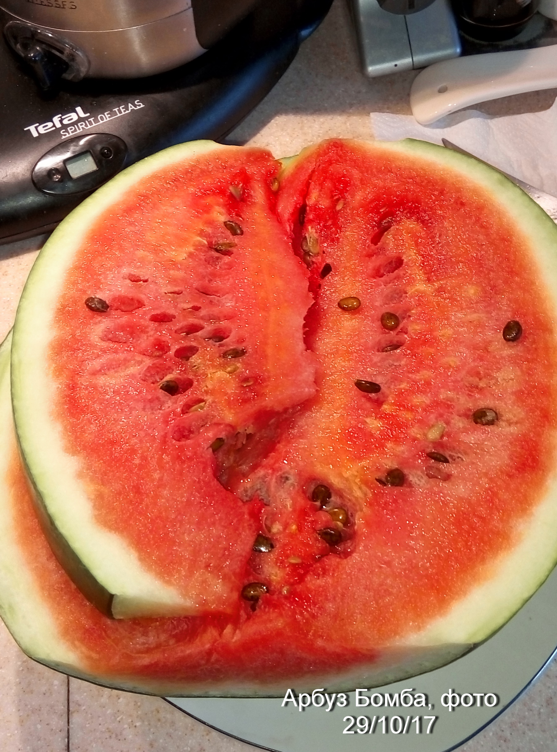 Сегодня поедаем последний арбуз этого сезона, очень сочный и сладкий (на удивление). Сорт Бомба, вес 8 кг, семена из СЗ.