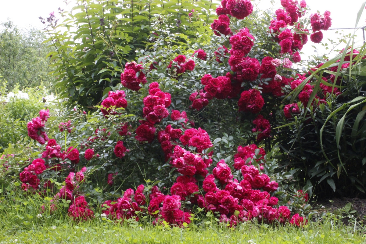 Ириш, а не вставить ли вместо спиреи что-то более мелкоцветковое, типа гипсофилы, пиретрума девичьего? Не хватает фона, все цветы почти одного размера... Или белого не хочешь? У меня с алыми розами растёт буквица. Она хоть и не мелкая, но розы оттеняет. Чуть попозже выложу пару кадров с ней и без неё.