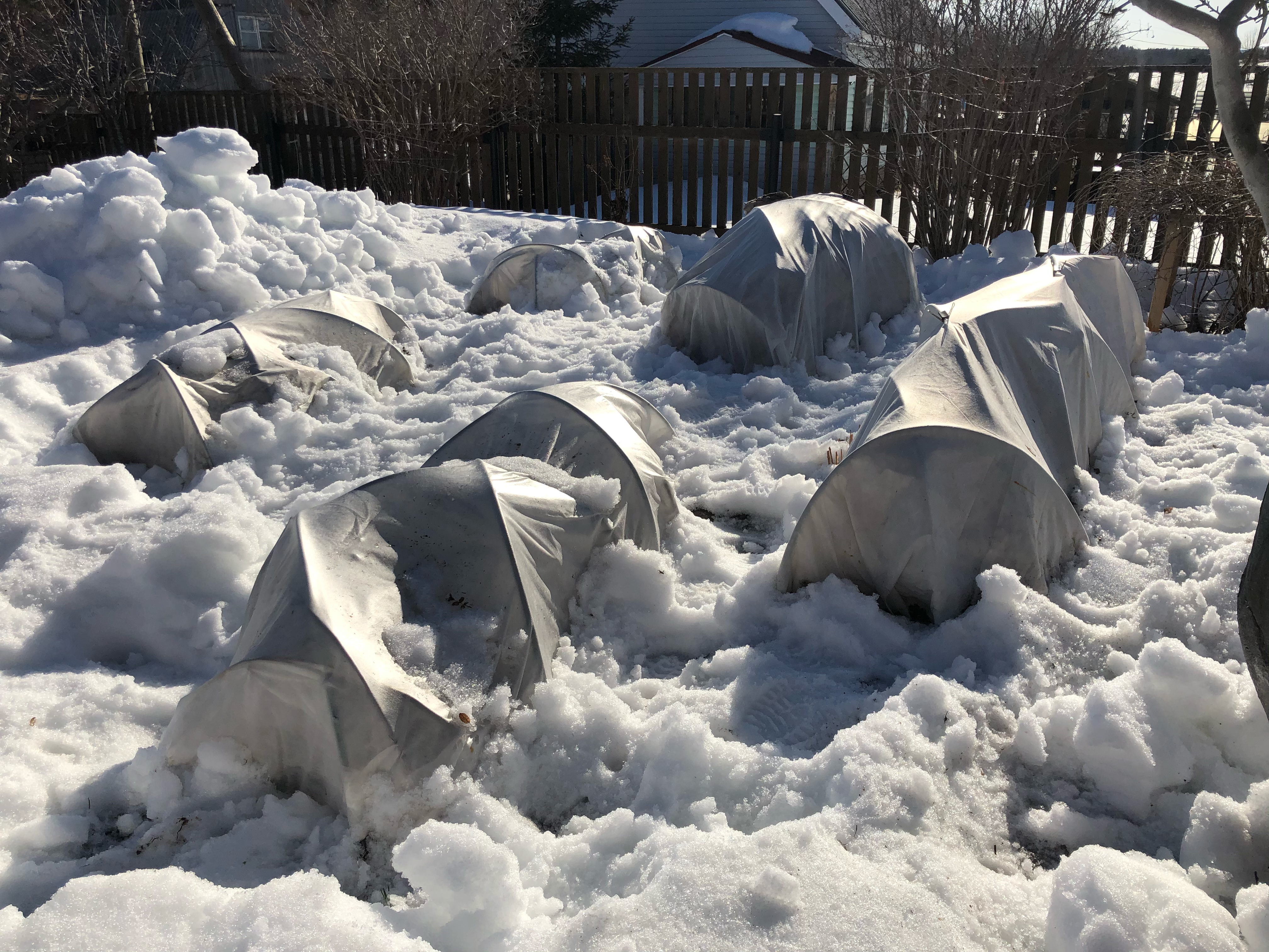 Под укрытия заглянуть пока нет возможности. Укрывной примерз.