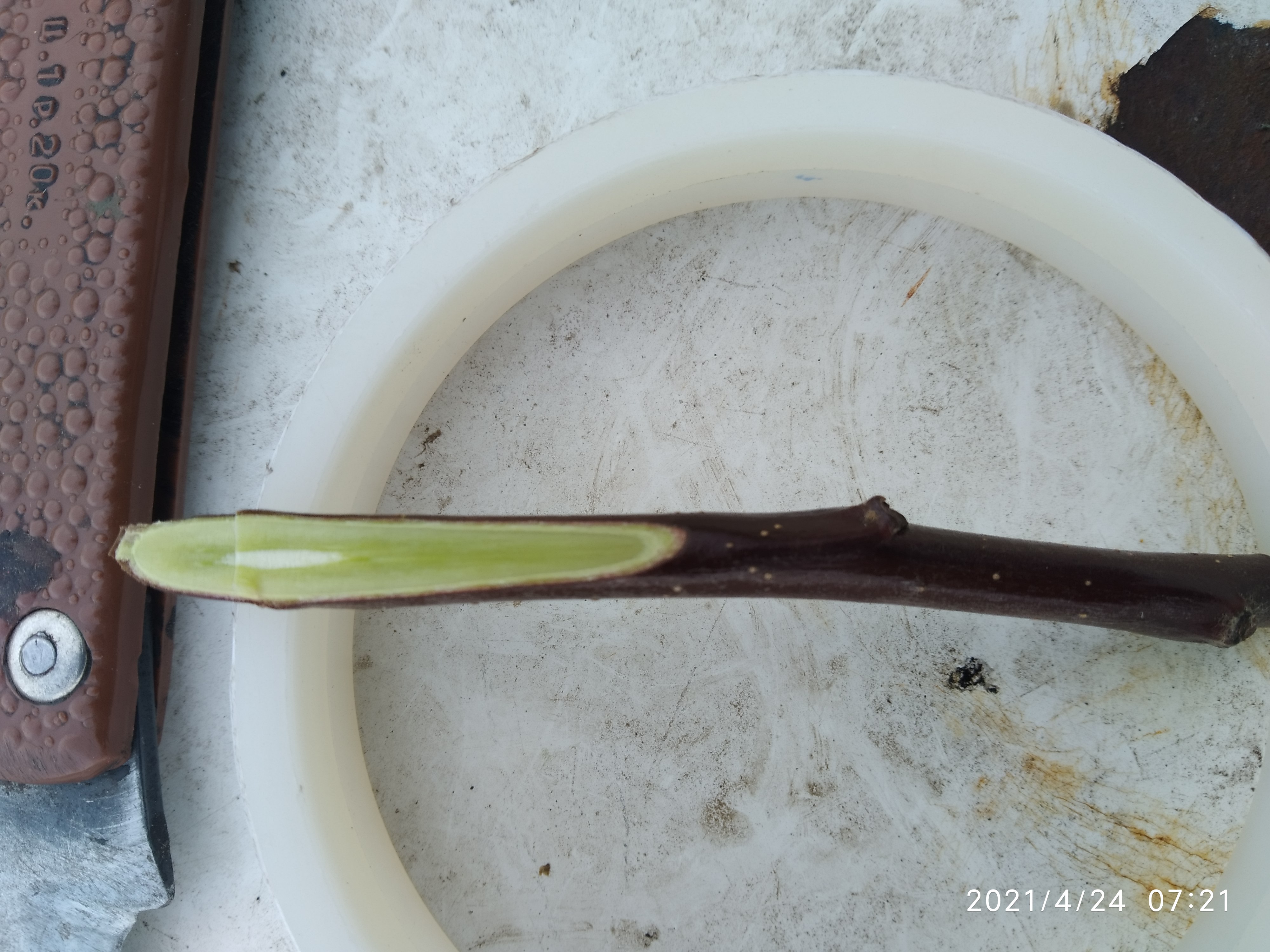 Насчёт прививочного материала, как говорил ранее никогда не замачиваю черенки перед прививкой, если они срезались вовремя, хранились правильно то в этом нет нужды. Правда иногда присылают мне и подсушенные и подмерзшие и с уже начавшими распускать почки, если что ценное то прививаю и стараюсь выходить если нет то выбрасываю не жалея. На фото черенок Зорки с моей яблони, срезал в декабре, хранил под снегом и в холодильнике.