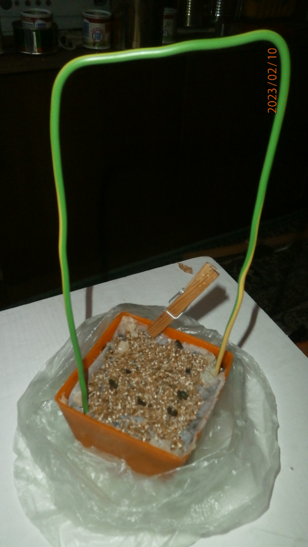 Грунт обработал ещё раз фитоспорином Далее, поместил в подобие минипарника. В верхней части пакета иглой проделал несколько "игольных"отверстий Через несколько дней подкормлю кальциевой селитрой и по поверхности насыплю жмых горчичный В таком виде это сооружение будет находиться под фитолампой круглосуточно,до появления первого настоящего листа.
