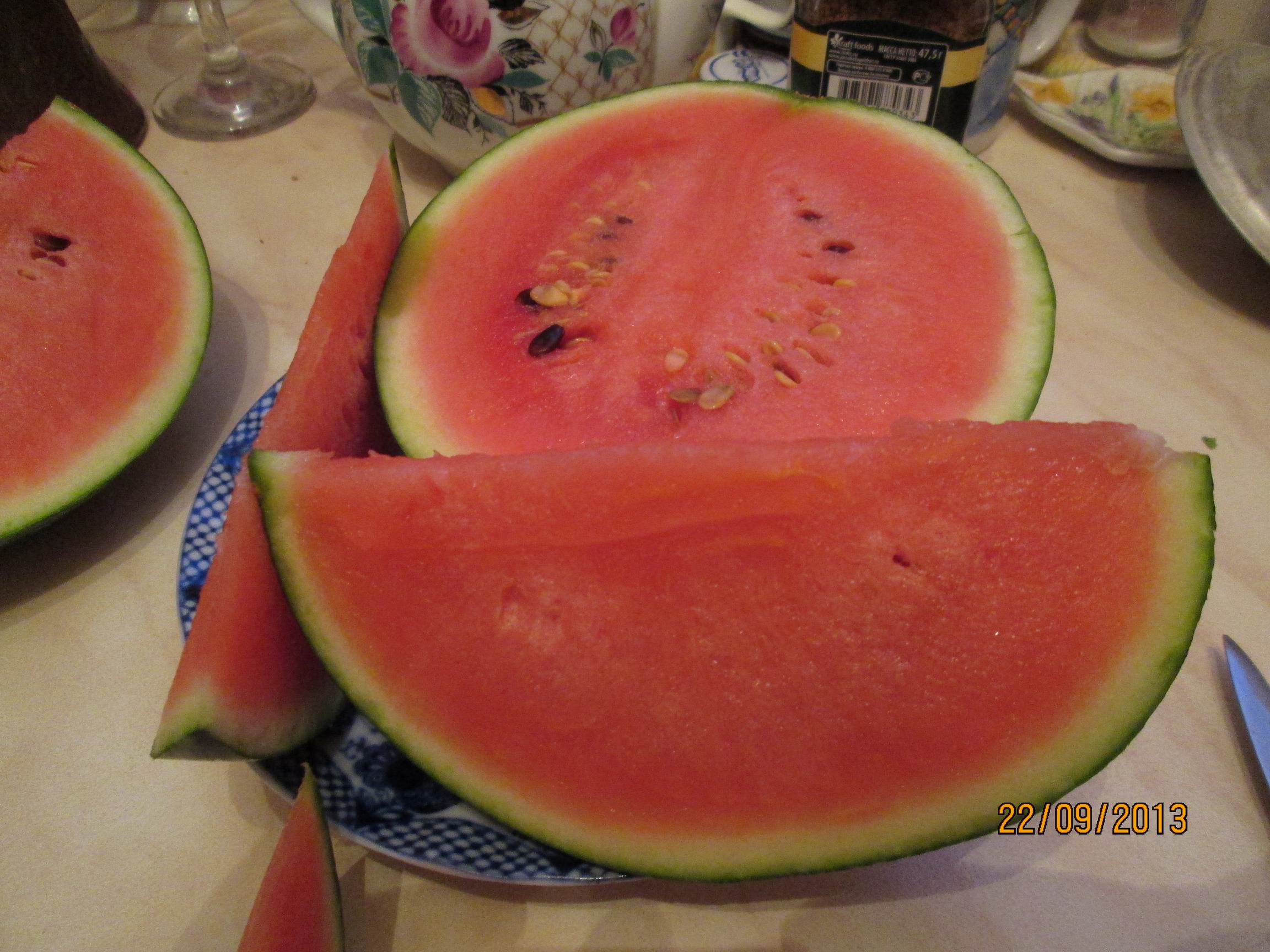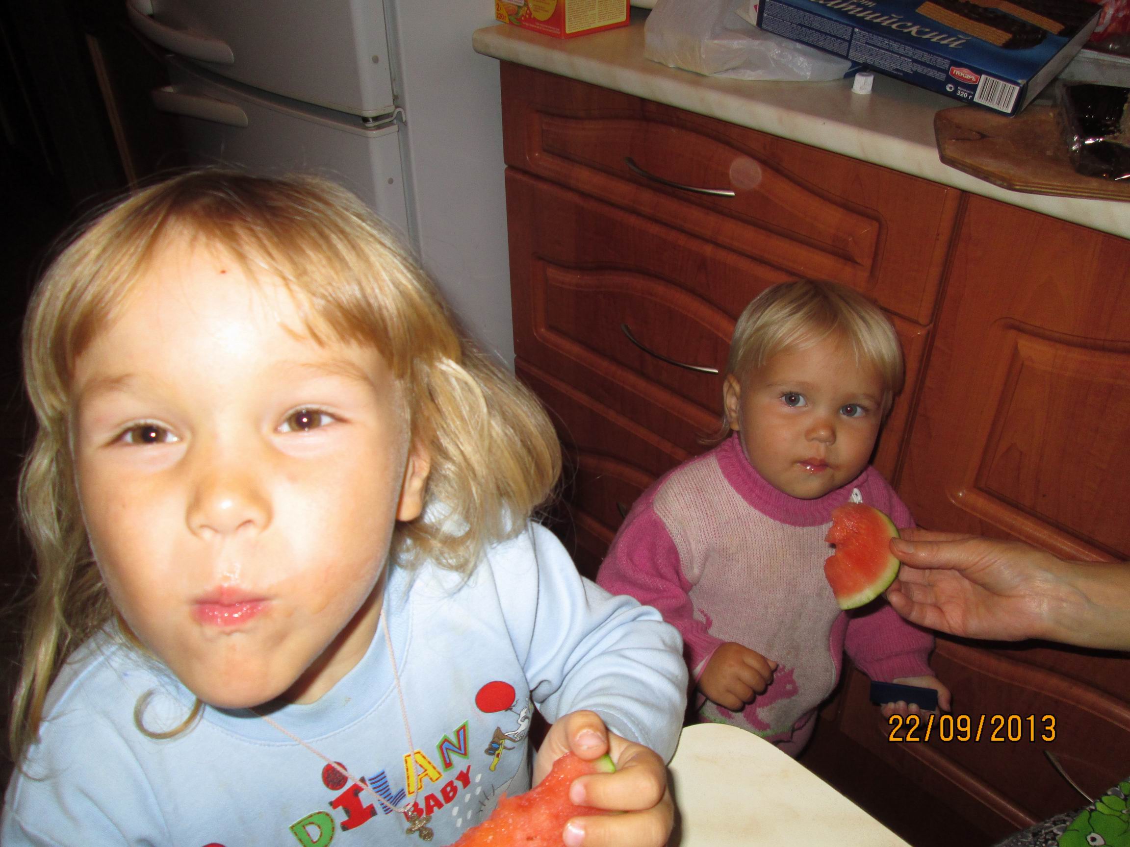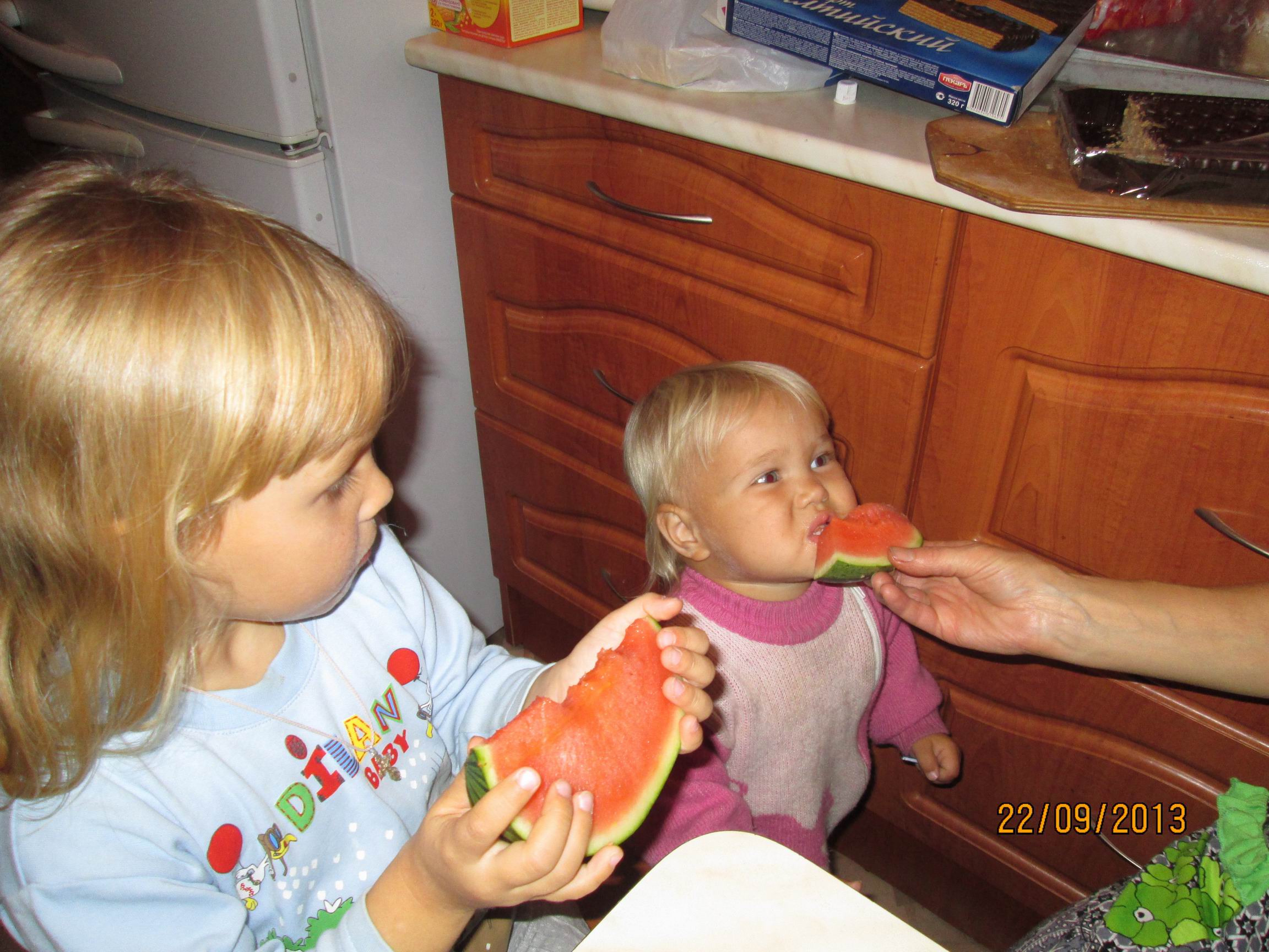 В воскресенье взрезал последний арбуз, ну и накормил внучек, хоть и белёсы семушки, а сладкий!!!