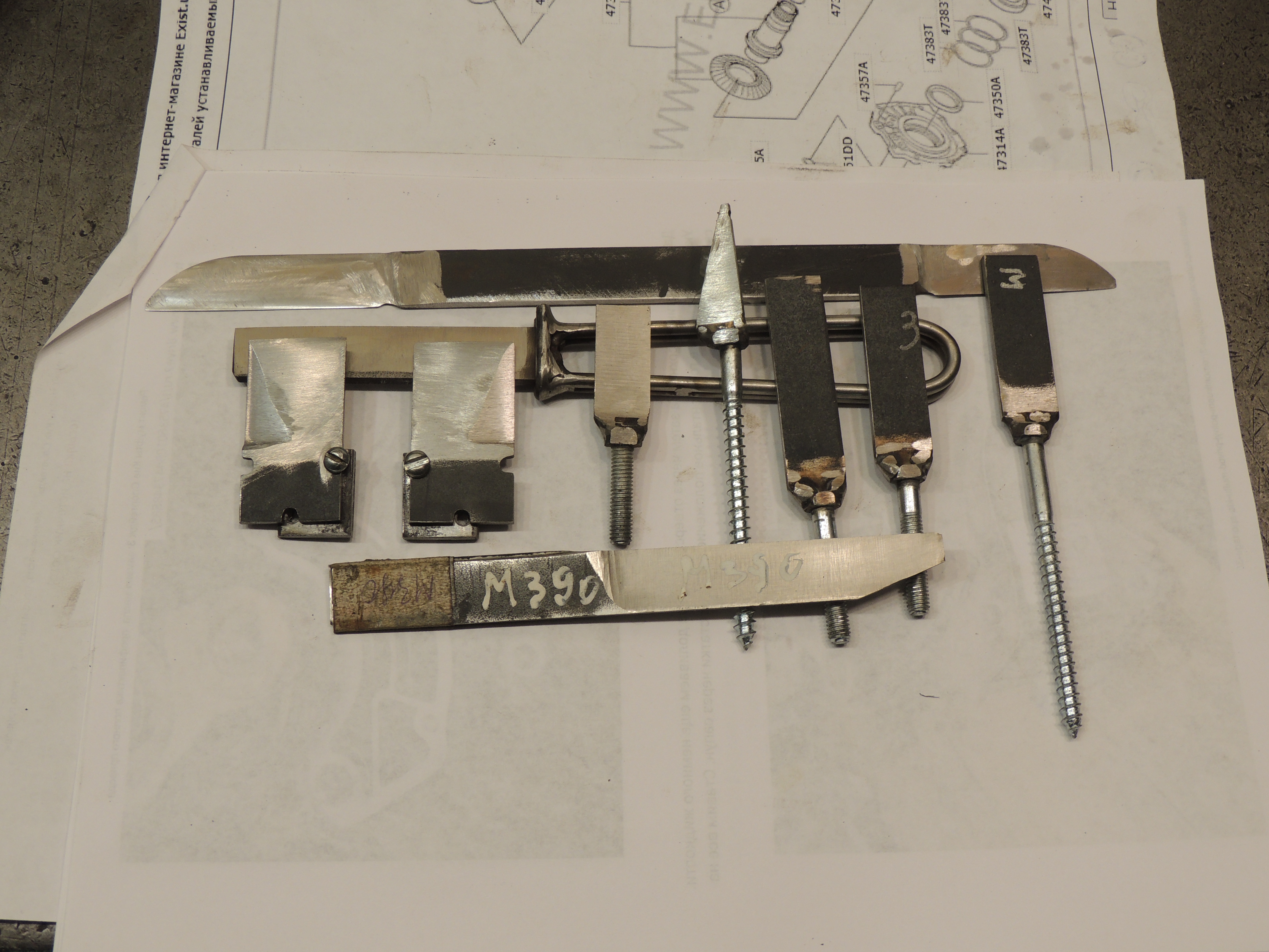 Ножик на нижнем снимке, спрятанный под тремя, горизонтально, с голой ручкой я точил зимой, после НГ. Так и пользуюсь...)))) Четыре типа сталей . Заготовки я фотать не стал.