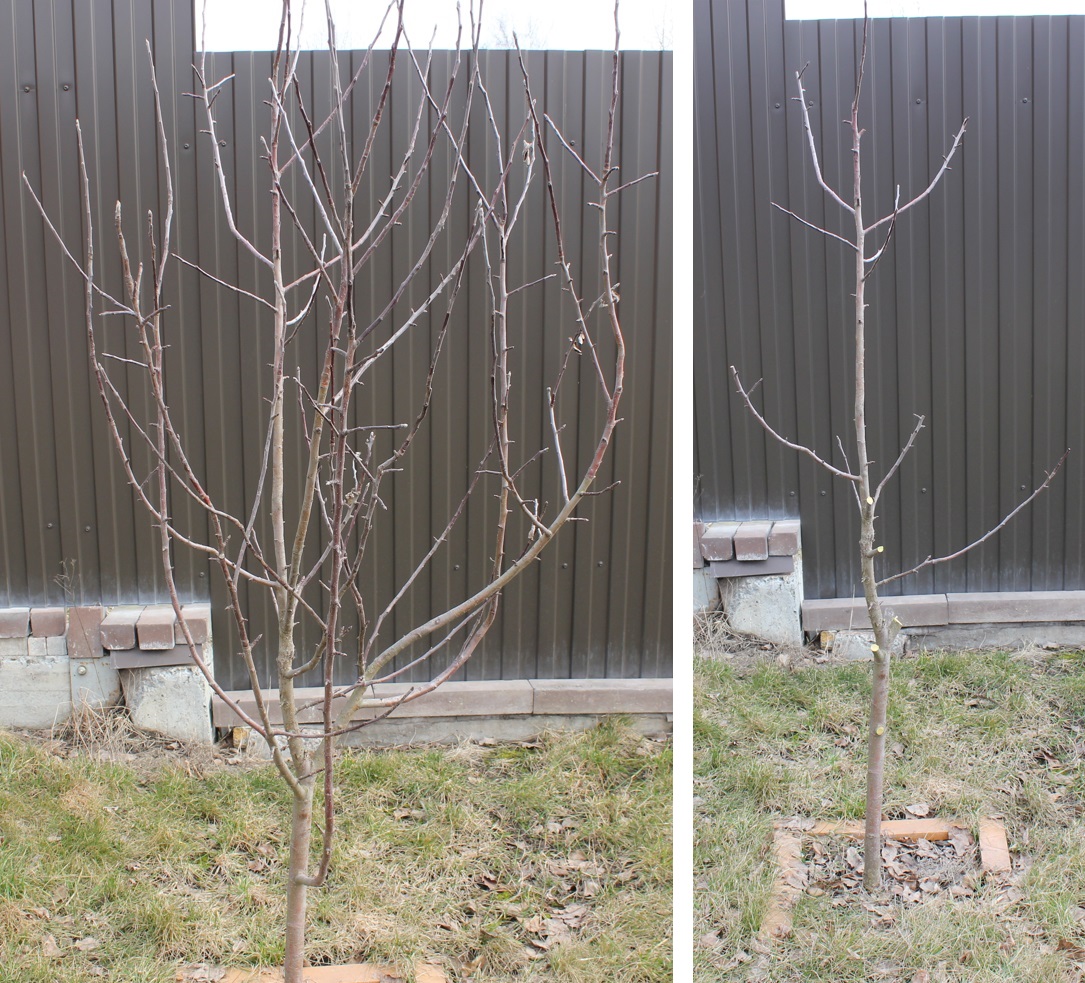 yri писал(а): 25.03.2023, 13:41 Сегодня выходной от сада и пришлось первую половину посвятить обрезки по спасению саженцев знакомых, по просьбам и т.д.. Я хочу отметить что когда продаете или даете саженцы на клоновых подвоях необходимо сразу предупреждать что такие саженцы как только посадили в саду требуют обязательной агротехники-обрезка, приствольный круг и т.д.. Как правило покупатель не имеет ни малейшего представления. На фото Зорка-ММ106 до и после обрезки. Здесь деревья сиьно запущены и применена радикальная обрезка на замещение плюс оставлены плодоносящие ветки. В дальнейшем дерево будет формироваться по типу веретена.