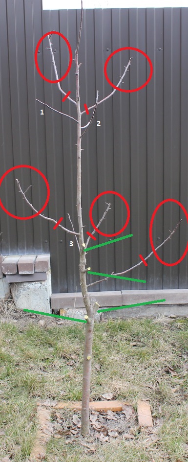 Продолжу свою мысль... Что бы было более понятно схематично отмечены красным цветом плодоносящие ветки (отнормированные) которые затем будут убираться на "клик". Белым пронумерованы однолетние побеги, которые в текущем году заложат плодовые почки и зеленым предполагаемые побеги замещения для формирования дерева. Безусловно побегов замещения будет намного больше, но лишние будут удаляться.