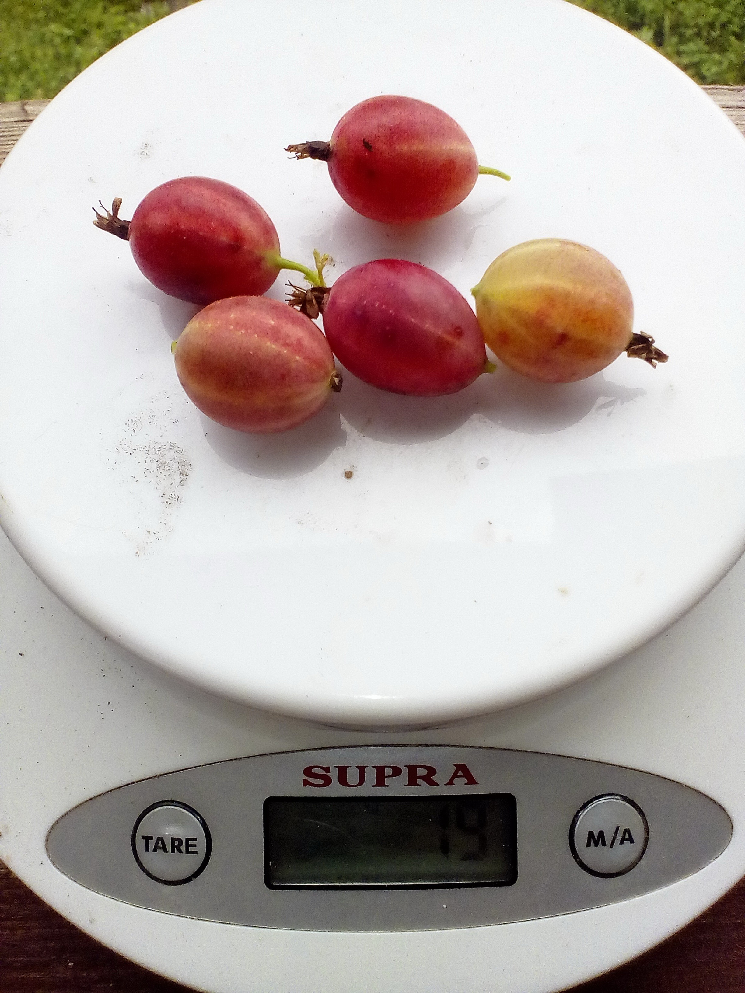 Первое сигнальное плодоношение сорта Уральский Розовый. Очень много завязи скинул куст, осталось немного ягод на кусту. Ягода вся крупная и вкусная. Куст очень неудобный и раскидистый. Окраска ягоды очень интересная и на фото тютелька в тютельку совпадают с эталонными.