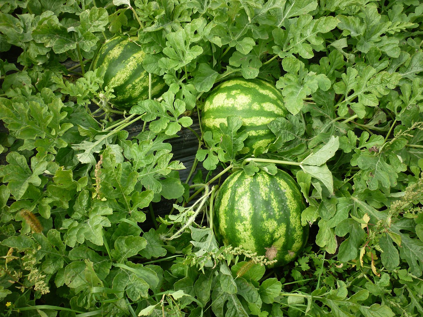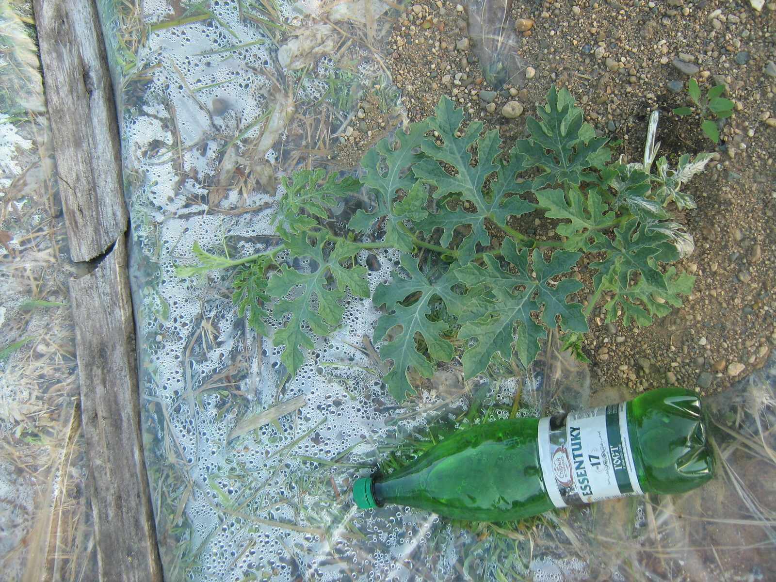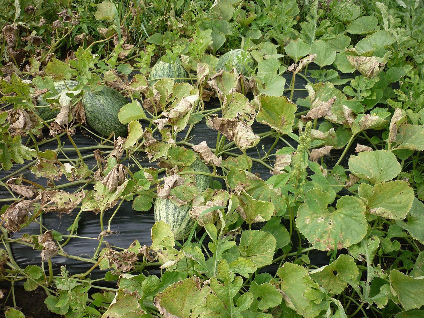 По поводу пленки еще раз обращаю ваше внимание на существенные на мой взгляд моменты:почва суглинок,не копалась,участок с определенным уклоном.Но как я для себя понял-пленка существенно ускорила развитие растений.На фото(снимал в конце августа ) растения арбузов из не привитой рассады высаженной на 10 дней позже-не болели,но и развитие совсем не такое мощное.Из не привитой рассады этой же партии,но на пленке выросли самые первые съеденные арбузы и 5 кг Огонек так же.