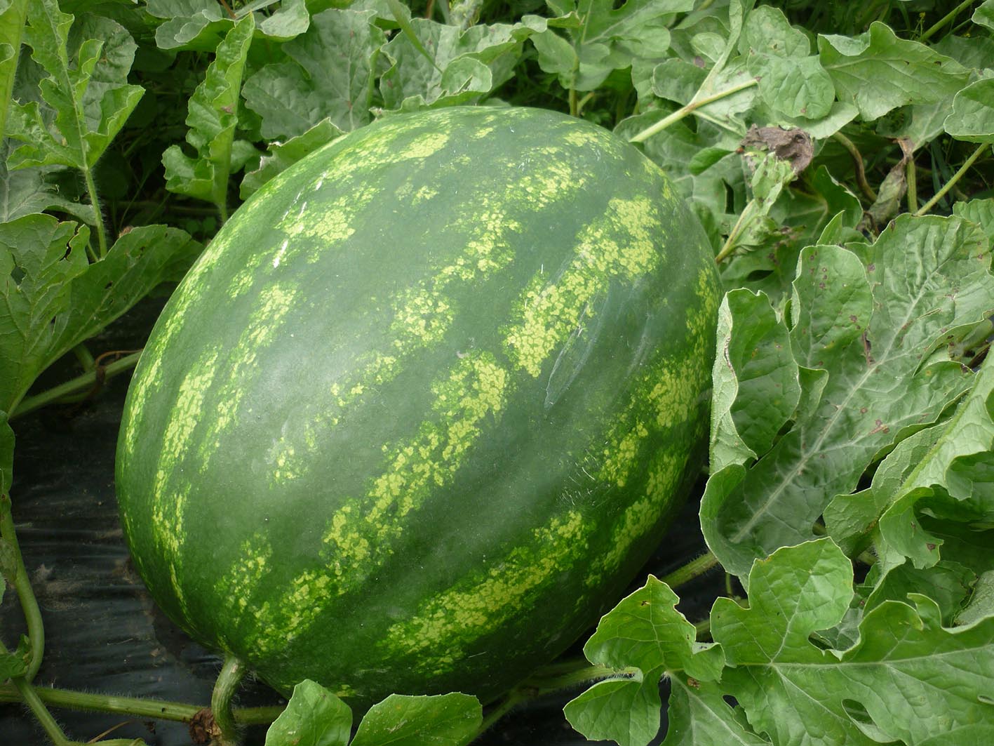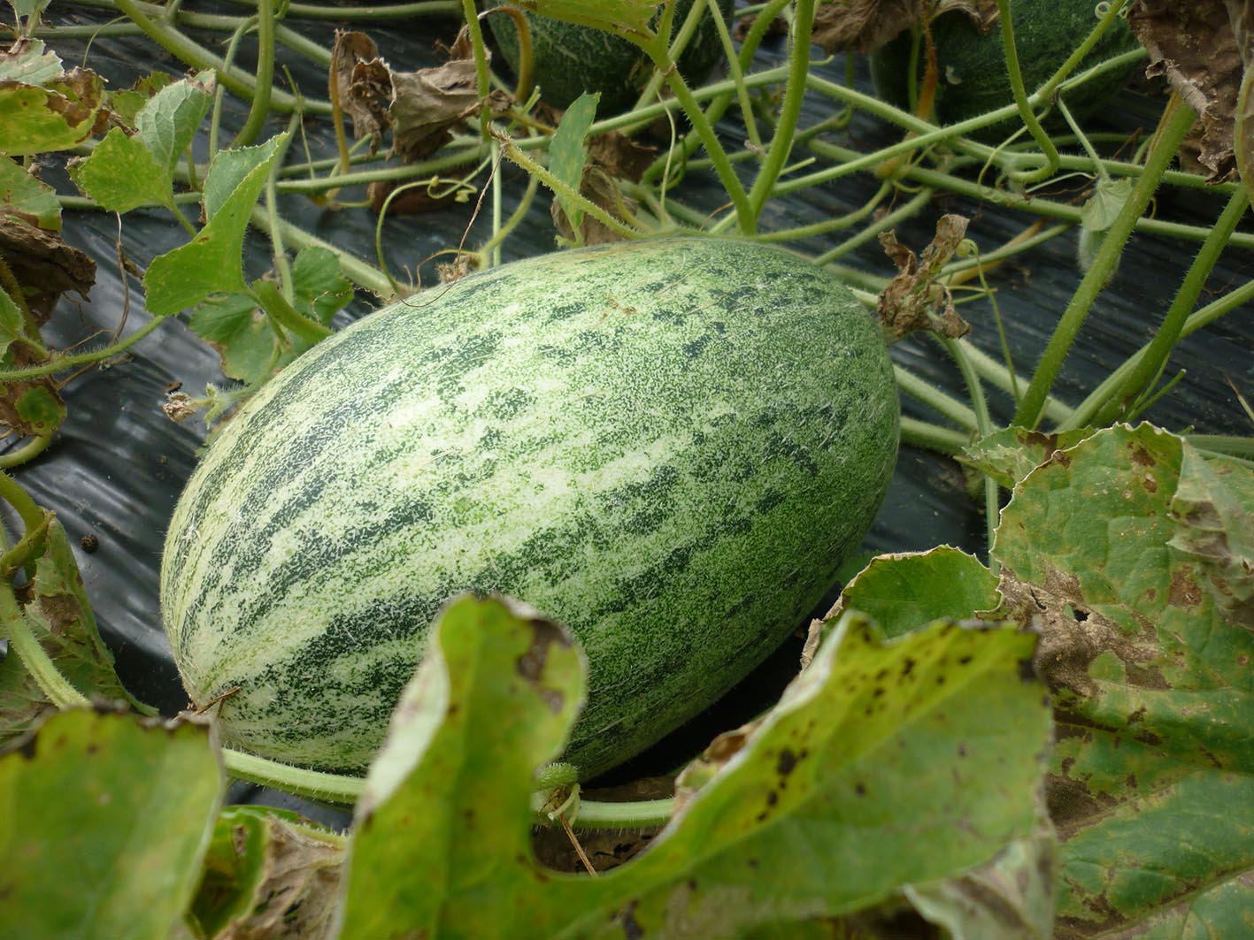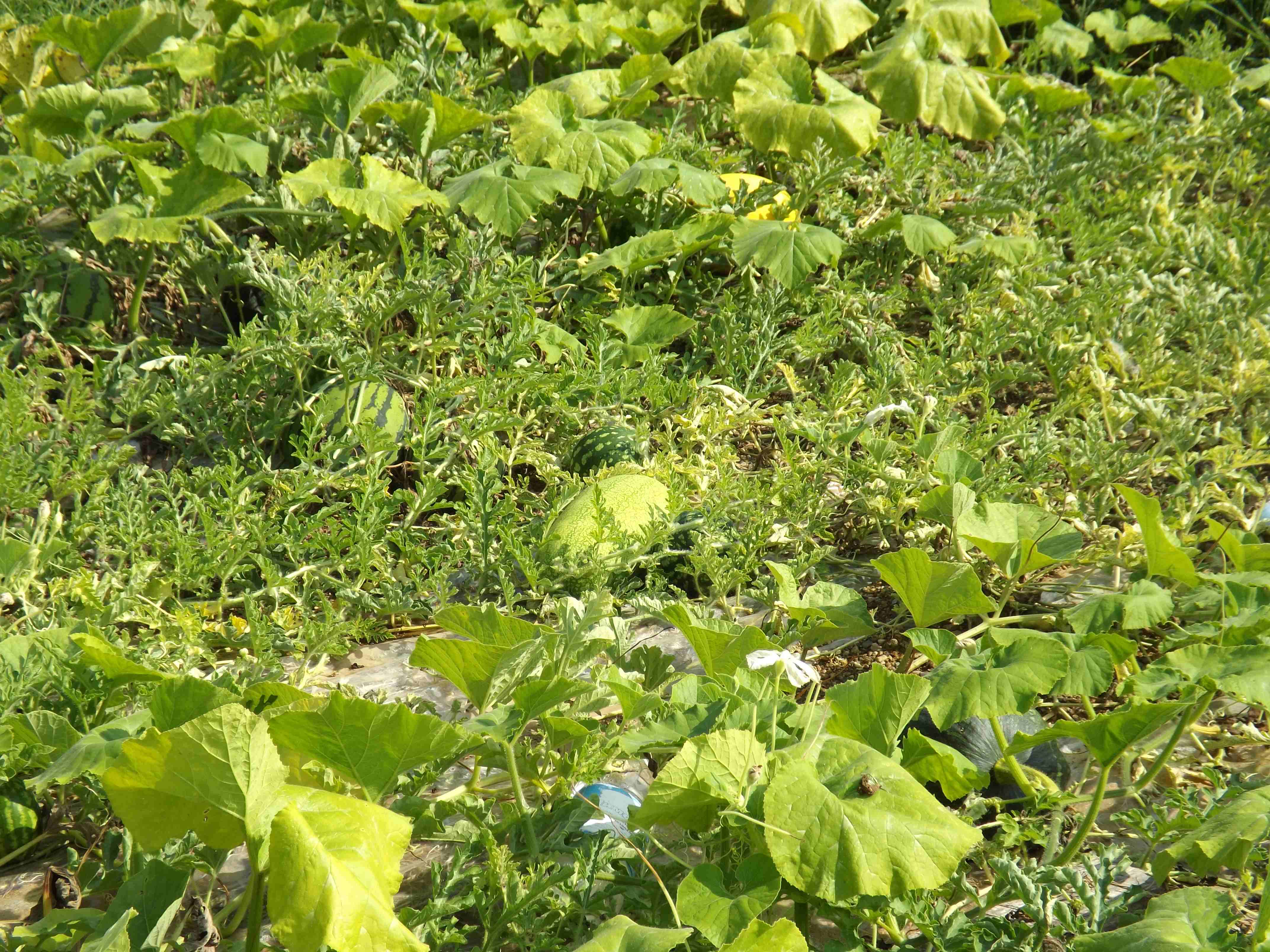 По поводу пленки еще раз обращаю ваше внимание на существенные на мой взгляд моменты:почва суглинок,не копалась,участок с определенным уклоном.Но как я для себя понял-пленка существенно ускорила развитие растений.На фото(снимал в конце августа ) растения арбузов из не привитой рассады высаженной на 10 дней позже-не болели,но и развитие совсем не такое мощное.Из не привитой рассады этой же партии,но на пленке выросли самые первые съеденные арбузы и 5 кг Огонек так же.