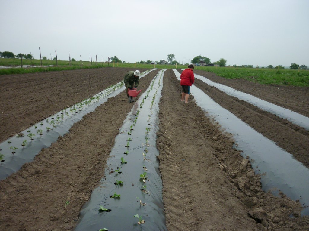 Елена занимается выращиванием земляники на пленке, поэтому у неё есть пленоукладчик :D трактор с приспособами...в ручную так не уложить, тем более на такие площади, я тоже выращиваю на пленке, вручную раскатываю, шпильками из проволоки прикалываю и высеваю в прорезанные отверстия, отверстия укрываю пятилетровыми бутылками, когда появляются всходы бутылки снимаю, отверстия мульчирую перегноем, можно использовать и рассадный способ, который тоже применяю, плети не отслеживаю, растут сами по себе.