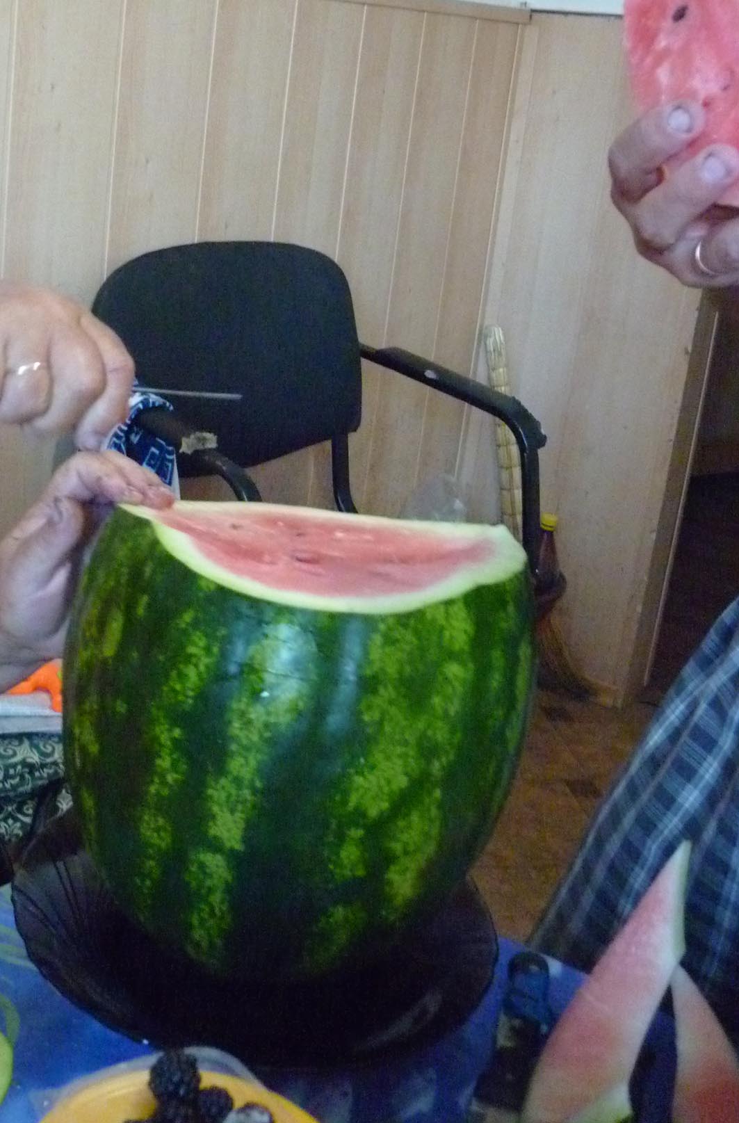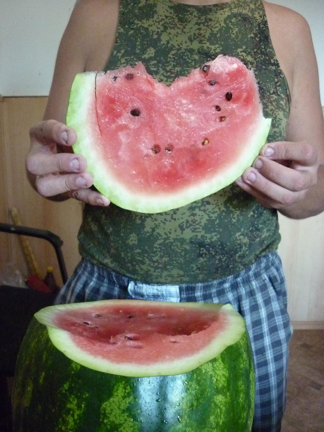 Нам понравился:кора тонкая,лопнул при съеме прямо на грядке;нам показался довольно освежающим,сладким,но не приторно;были твердые включения,но по моему это вызвано условиями нынешнего лета,семечек довольно много;привитый корень потянул две ягоды:одна по моему 7,5 кг,вторая около 3 кг.