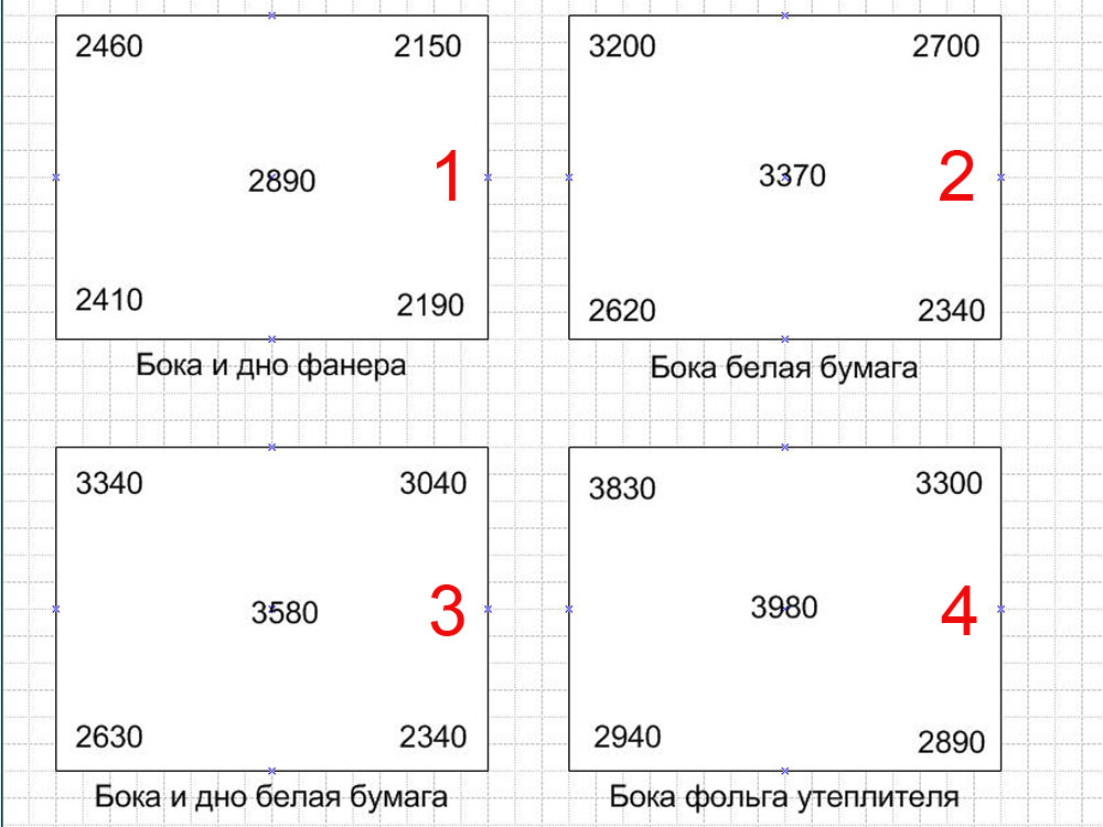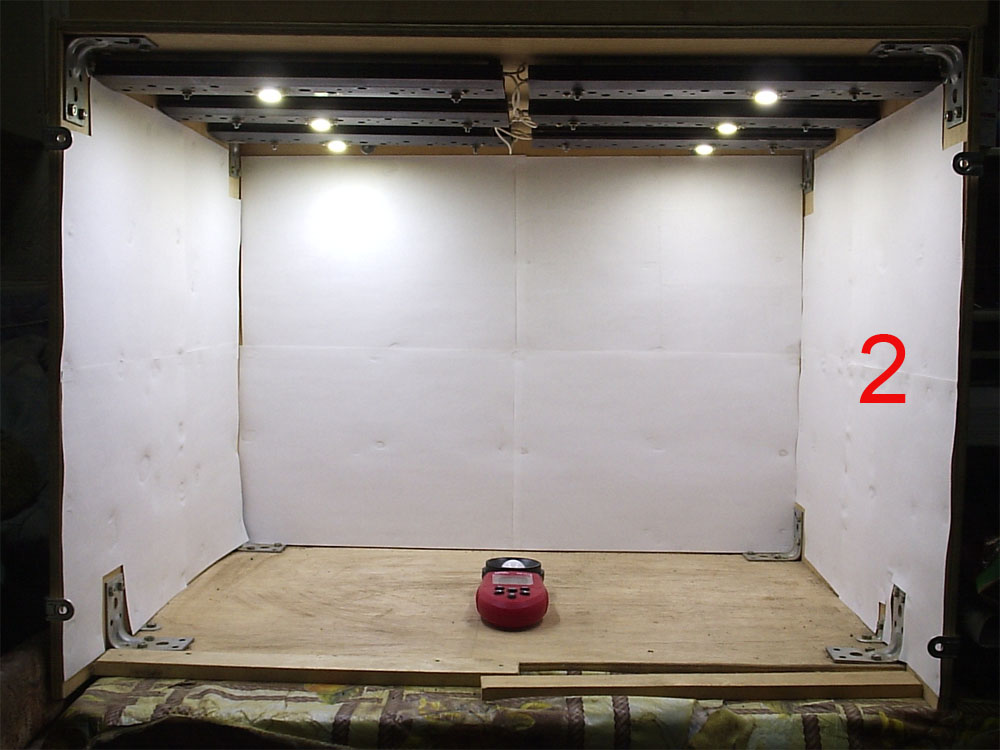 Это первый вариант замеров освещенности , эталонный №1 Вариант №2 , три бока обклеил белой бумагой Вариант №3 , уложил еще листы на дно короба Вариант №4 , на боках расположил фольгированный утеплитель