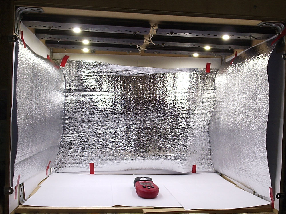 Понял, спасибо! У меня есть люксметр, но габариты "коробки" другие и освещение там от ламп дневного света. Грубо перемерил освещение: 1-й вариант-стенка из обычного картона, 2-й вариант-белая бумага, 3-й вариант-пищевая фольга. Прибавка по освещенности получилась 100%, 110% и 120% соответственно.