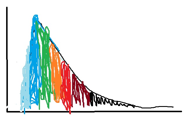Не нашел у себя в архиве скопированное на чужом сайте изображение полного спектра солнечного света. Но поверьте на слово, оно представляет вот такую характеристику: Извините за качество изо, в Paint это не быстро... Здесь по высоте отражена мощность цвета, а по горизонтали - длинны волн этой мощности видимого спектра Солнечного света. При рассмотрении видим, что левая часть (которые называются ультрафиолетовой и голубой частями спектра) по мощности чуть-ли не в двое больше, чем видимая красная часть (длинноволновая). Вот почему Вас так привлекает ледяной свет подсветки и это правильно. Но также можно увидеть, что в спектре есть и зелёная составляющая, которую при домашнем моделировании некоторые считают ненужной, неэффективной для растений. А сколько мощности, от общей мощности светового излучения, составляет зеленый спектр? Да не более 15%. Стоит-ли столь малая часть зеленой энергии того, чтобы её исключать, лишая себя удовольствия смотреть на растения в природном, а не извращенном пурпурном свете. И еще, что надо бы заметить глядя на спектр: - Хоть инфракрасная (тепловая) составляющая спектра и мала по амплитуде, по частоте она весьма продолжительна. Таким образом, если её сложить (интегрировать) она окажется весьма значительной, более 25%, а это, не забывайте, в природе единственное тепло, согревающее нас. Тепло Земли на глубине 40 см. большую часть года, не превышает 7 гр. и как только Солнце, даже не уходит за горизонт, а всего-лишь скользит по поверхности земли больше нескольких месяцев - к нам приходит Старый Новый год.
