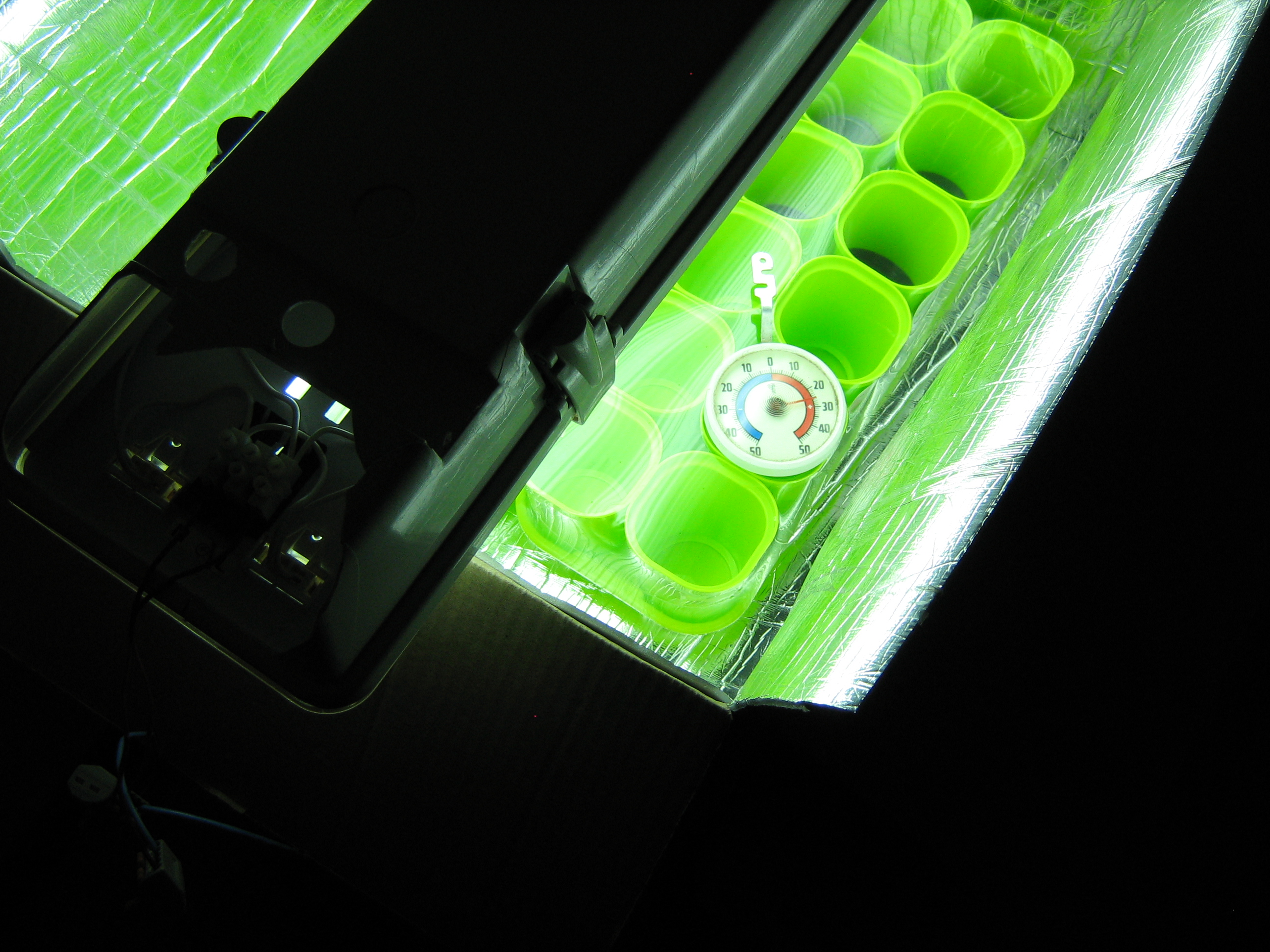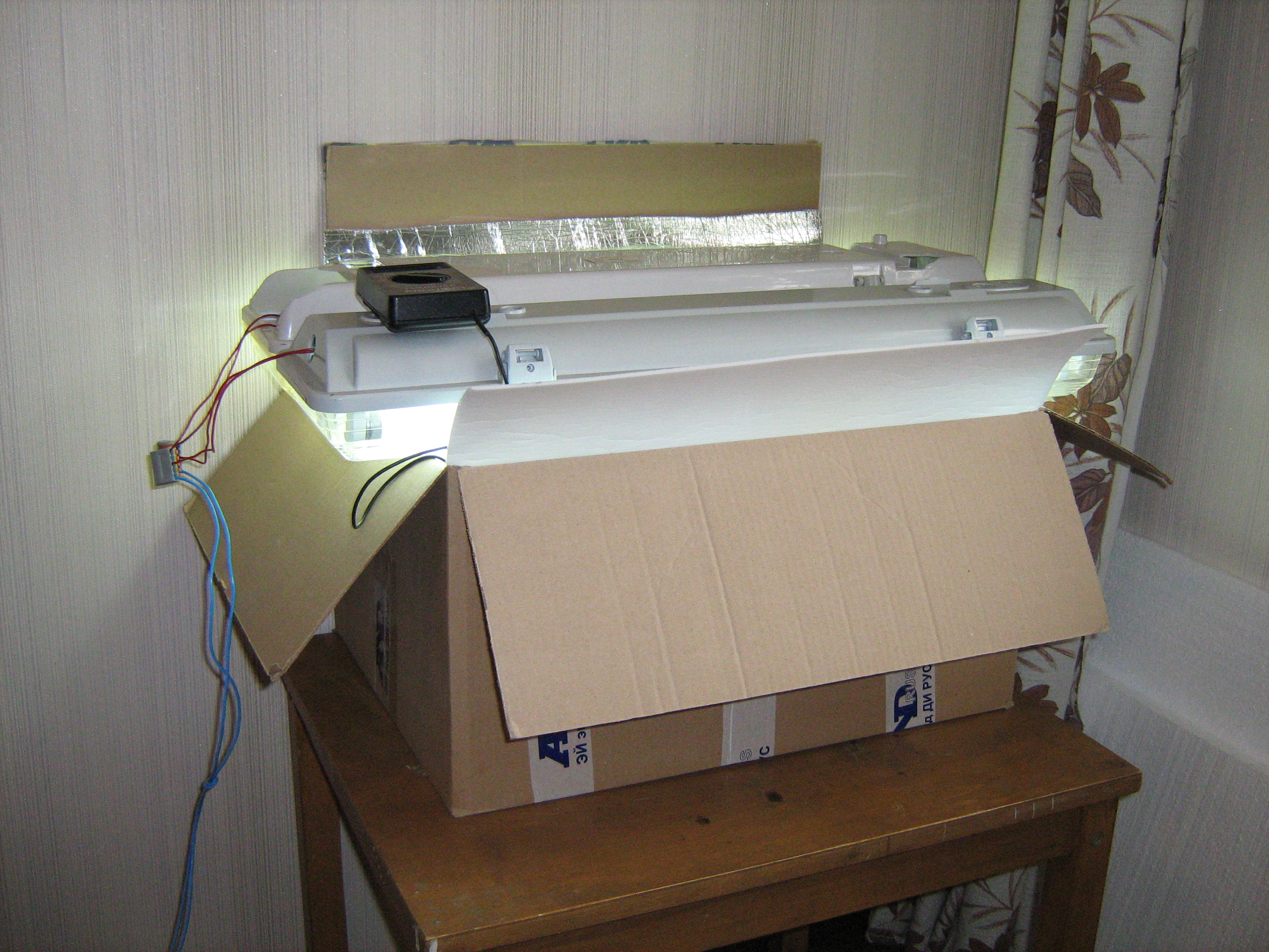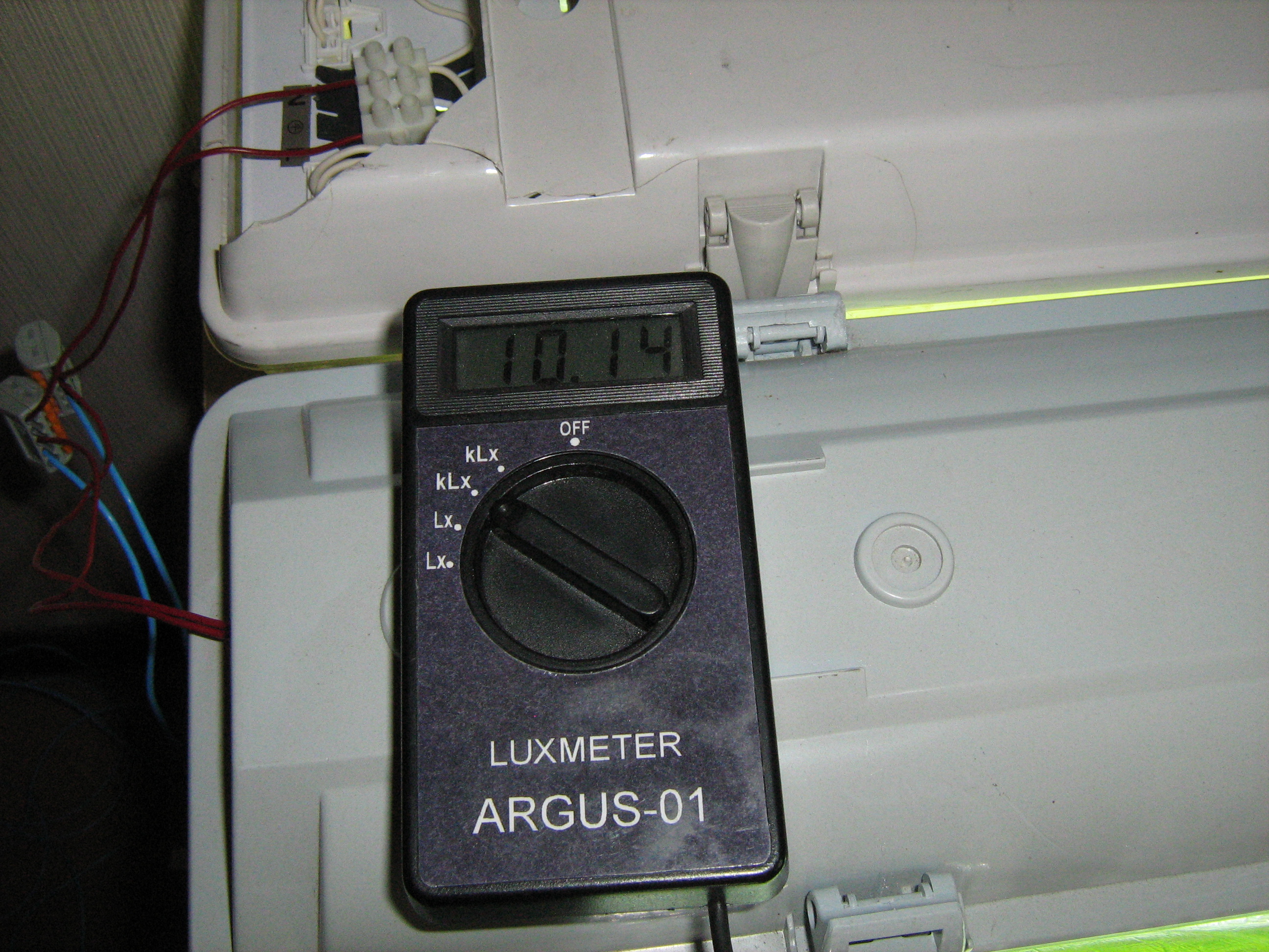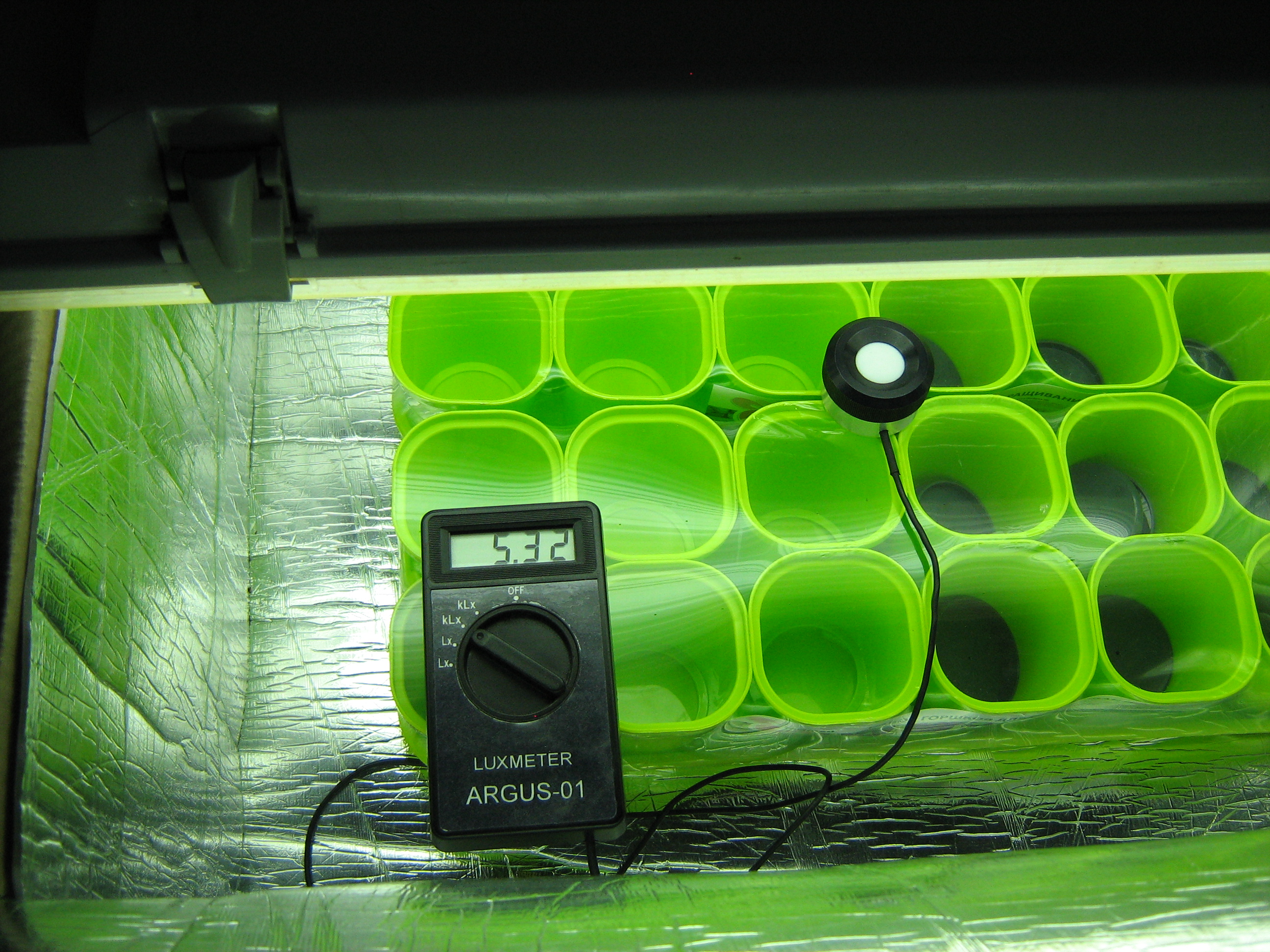 обклеил её изнутри отражающей пленкой прямо на неё установил два светильника с лампами дневного света, в каждом по две лампы 18 вт белого свечения освещенность получилась более 10000 люкс, на мой взгляд многова-то, не страшно-можно один светильник убрать...- АндрейВ
