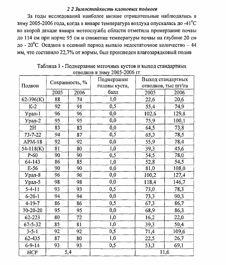 За последние годы проведено промораживание 870 новых форм подвоев при температуре -14;-16;-18°С для корней и 35°С для однолетних приростов. По результатам промораживания выделены наиболее морозостойкие формы, корни которых успешно выдержали температуры до -16ºС: 67-34(18), 62-223, 73-9-3, 67-133(32), 75-1-89, 70-3-51, 69-10-336, 65-836, 65-772, 69-21-5, 61-32; до -18ºС: Малыш Будаговского, 62-223, 67-133(32), 67-34(18), 61-32, 69-10-336,57-146; однолетние приросты до -35ºС: 3-3-35, 3-4-98, 62-223, 76-8-13, 76-16-15, 76-19-59, 76-23-1, 67-34(18), 67-133(32), 69-10-336, 75-1-62, 57-146.