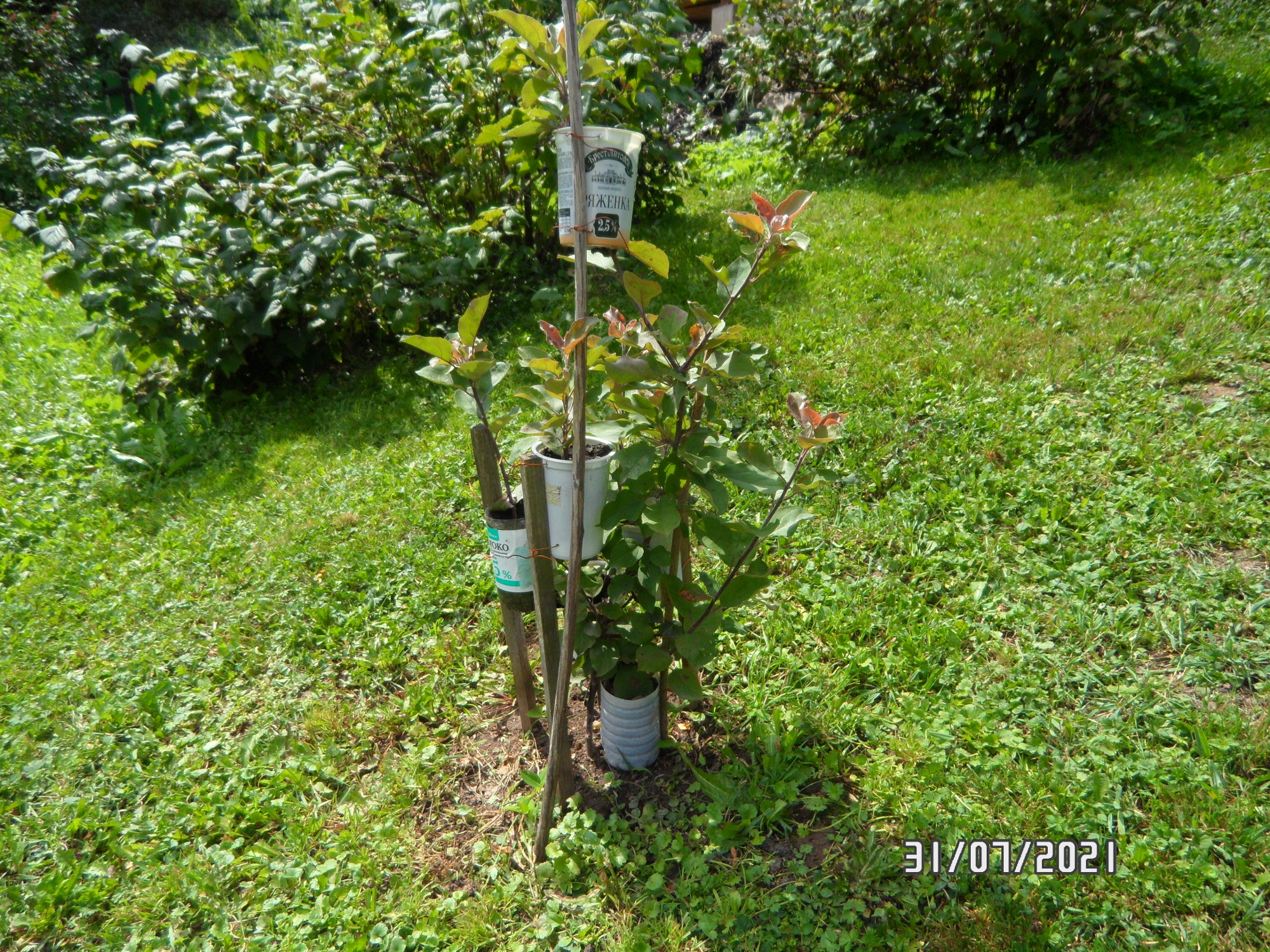 В первом случае сеянец яблони имеет идеальную шаровидную форму которая равномерна освещается солнцем ВЕСЬ световой день. При этом имеет оголенные скелетные ветки, минимальные приросты цветение на переферии кроны и как следствие плоды максимального качества.