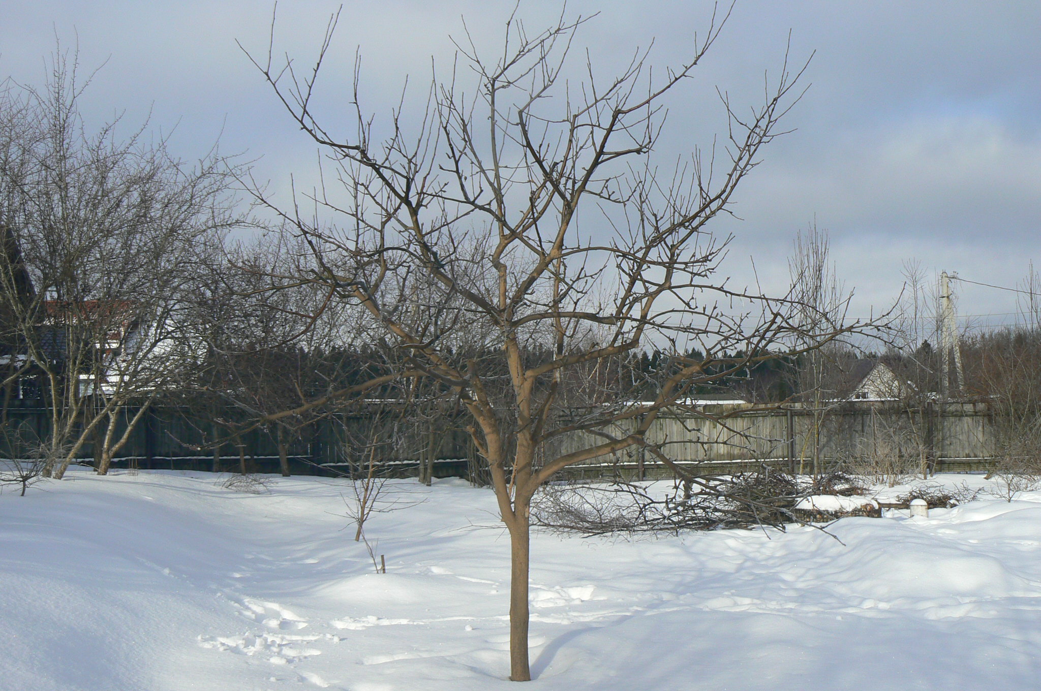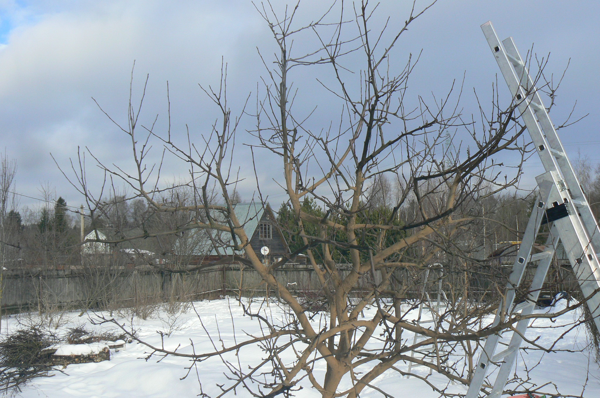 13-летняя Китайка золотая ранняя с прививками. До обрезки. Обрезка. Обследование срезов - здоровые. После обрезки. Цвет коры - светло-коричневый - это глиняная обмазка.
