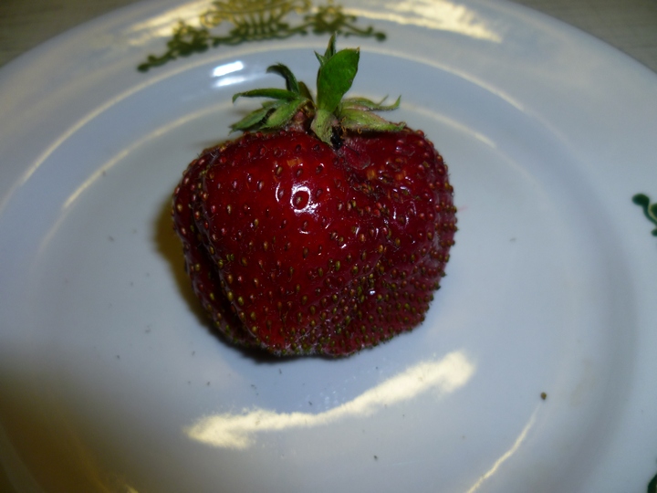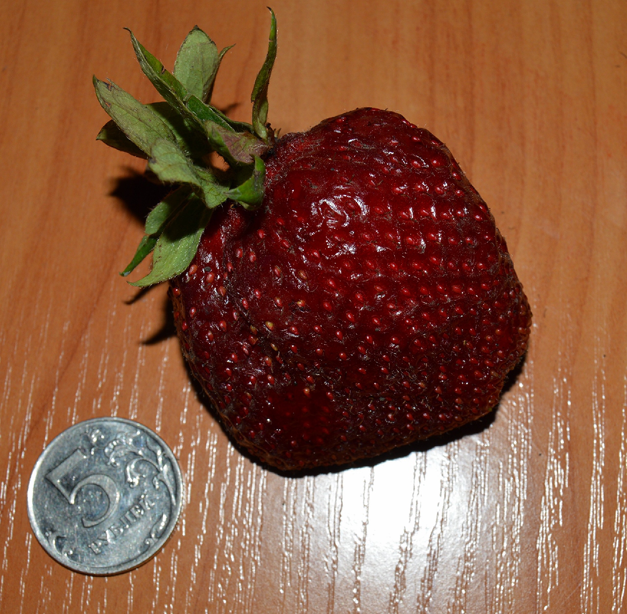 Сегодня при сборе ягод обнаружился вот такой экземпляр в посадках 4 годичной давности.Сорт не известен,дала усы знакомая,она то же сорт не знает.Конечно не много не дозрела,но сладкая и ароматная.Поспевают не одномерно,сначала один бок,потом другой,и хоть год дождливый и загущенная посадка,гнилых ягод нет.Сама ягода с одной стороны плоская,с другой с гранями в виде треугольника.